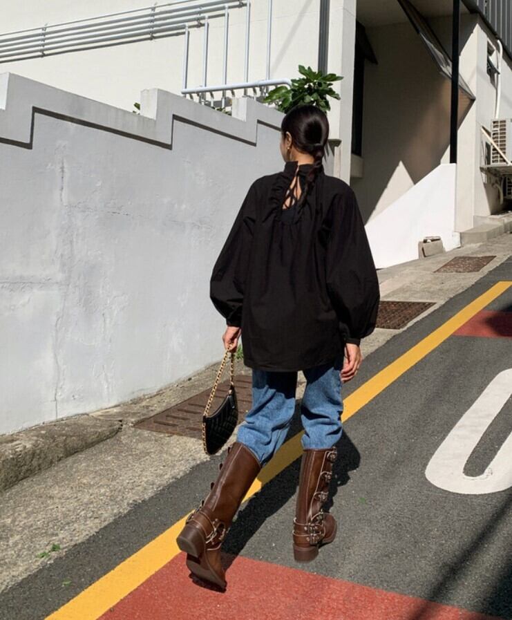 バックリボンのデザインがアクセントになったブラウス。レースアップデザインとパフスリーブが可愛らしさを引き立てます。ゆったりとしたシルエットで体型カバーも抜群◎