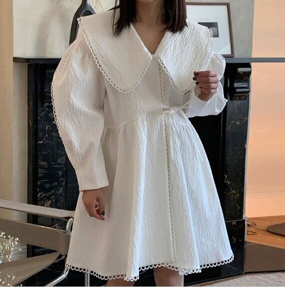 ワンピース ビッグカラー 膨れジャガード ラップミニワンピースミニ丈 膝上 セーラーカラー 縁取り 袖あり 長袖 パフスリーブ ラップ風 Aライン フレア リボン フェミニン ホワイト ママコーデ 韓国 人気 20代 30代 40代 休日 女子会 お呼ばれ こなれ感 秋 春 CO5359