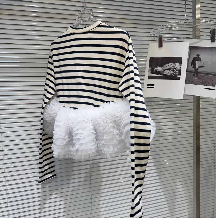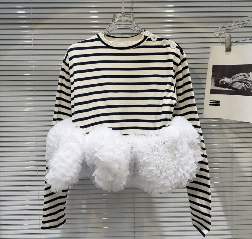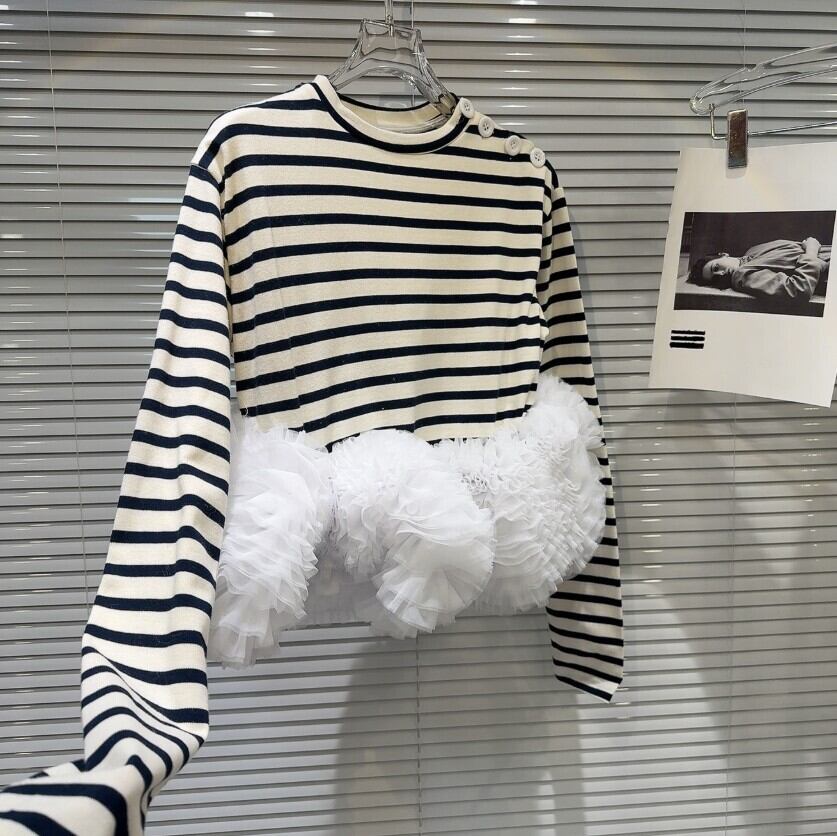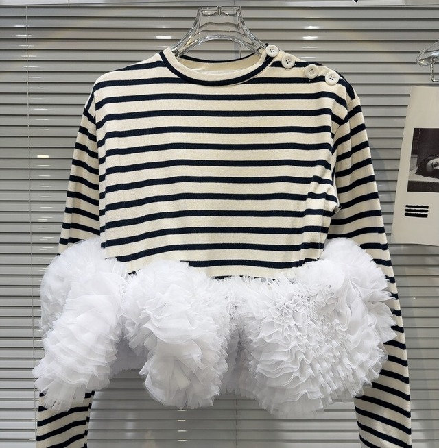ヘムボリュームチュールボーダートップス 裾チュールボーダートップス チュール異素材ミックス 長袖 肩ボタン 大人可愛い 20代 30代 40代 お出かけ 女子会 旅行 春 秋 CO5384