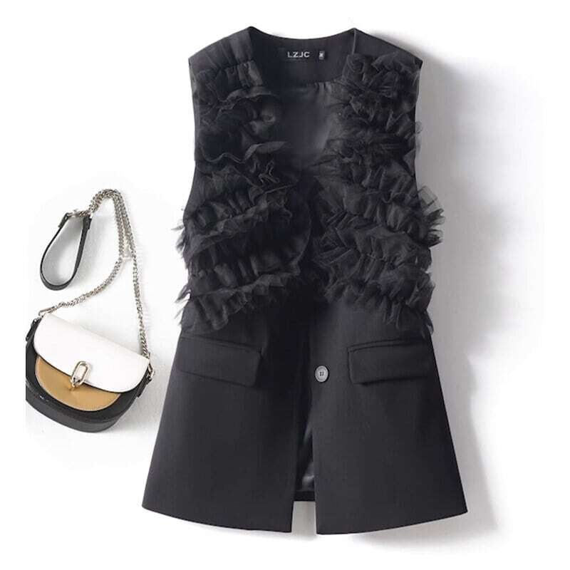 大人可愛いチュールフリルジレ!愛らしいチュールフリルとロング丈が魅力の一着。Vネックデザインが顔周りをすっきりと見せ、レイヤードスタイルにも最適です。オフィススタイルからデニムと合わせてカジュアルに楽しんでも◎