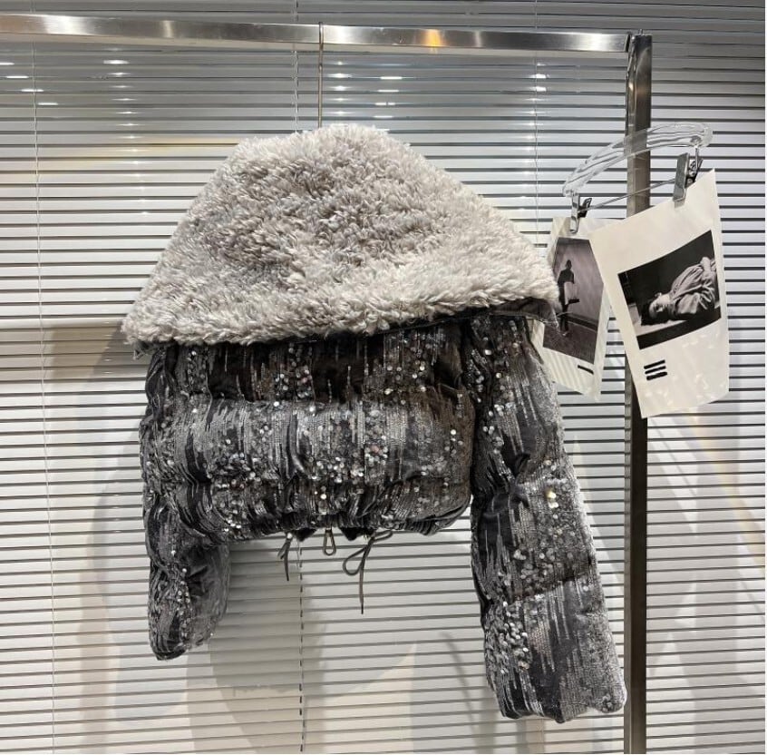 トレンドのビッグボア襟とキラキラスパンコール素材を組み合わせた主役級ショートダウンジャケット。冬のイベント、パーティー、ディナーなど華やかなシーンで注目の的!ドローストリングで裾の調整が可能なので、シルエットを自由に変えられます◎ふんわりとした防寒性とクロップド丈で、スタイルアップも叶える最強の褒められアウターです!