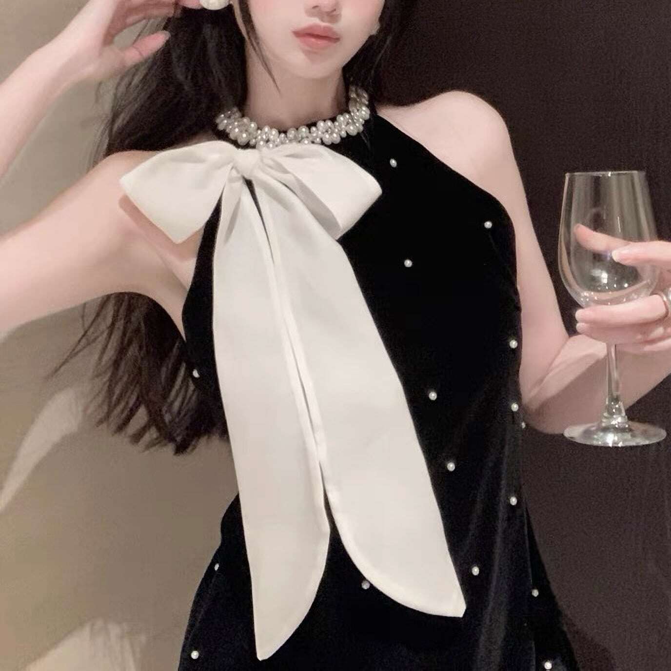 一枚でコーディネートが完成する、圧倒的な存在感を放つワンピースです。しっとりとした高級感のあるブラックのベロア素材に、首元の大粒パールと肩のホワイトリボンが、お顔周りを華やかに彩ります。