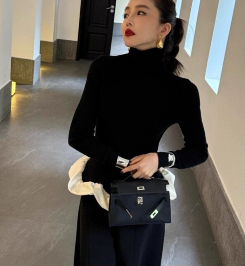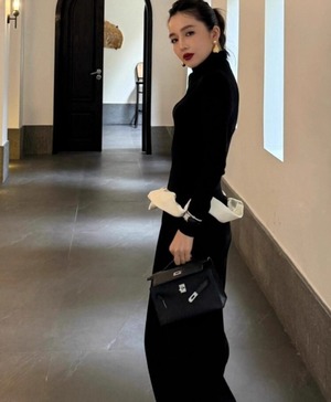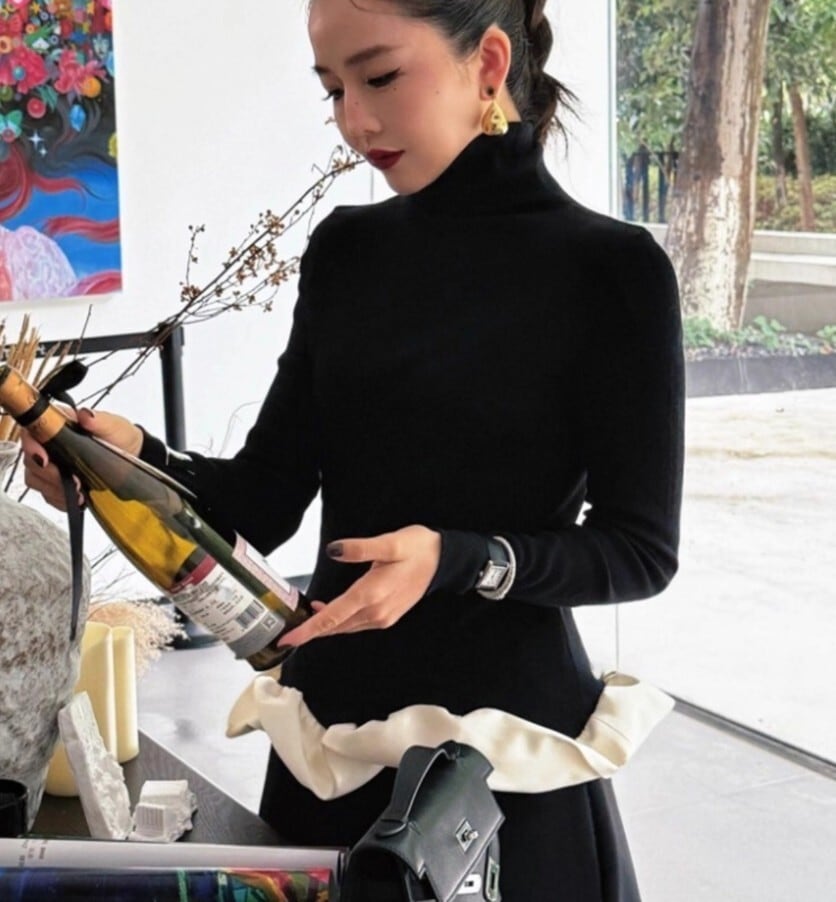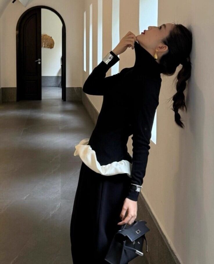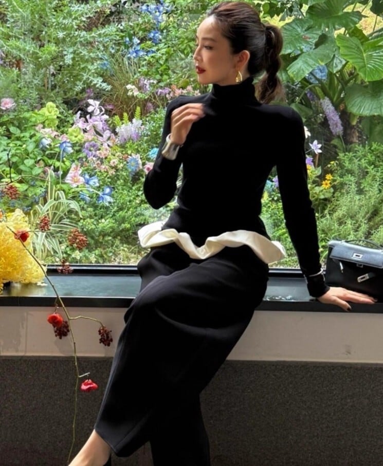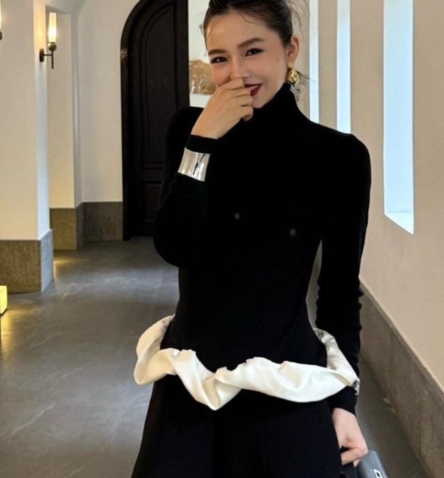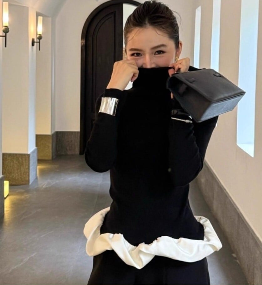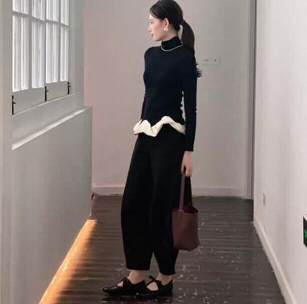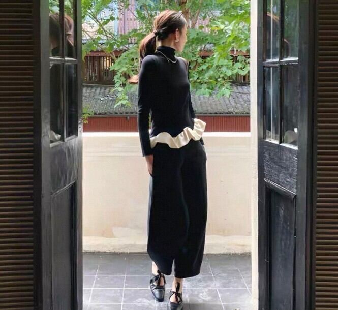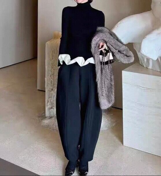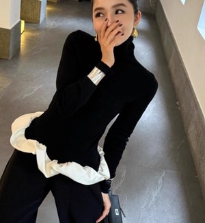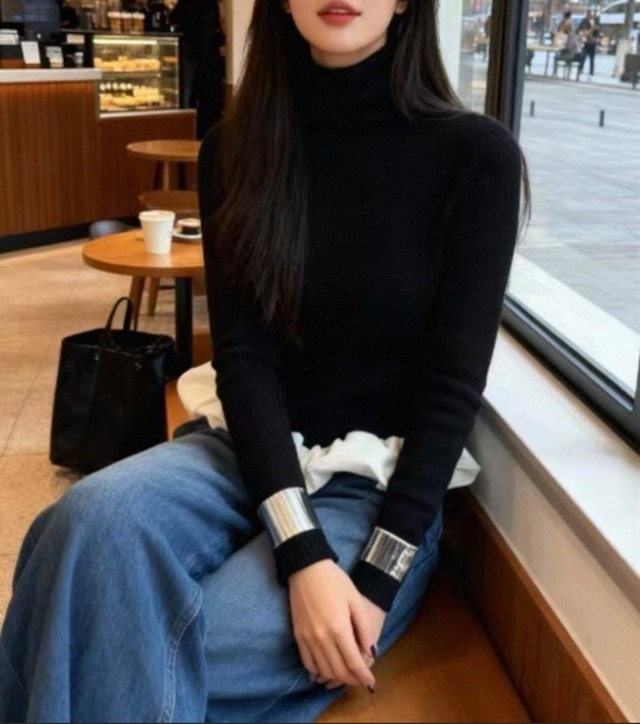 顔周りを上品に見せる、程よい高さのタートルネック。 ブラックやグレーの落ち着いたトーンに、白のフリルを効かせたモノトーン配色が、甘くなりすぎない「都会的なフェミニン」を演出。 デイリーなお出かけから、少し背筋を伸ばしたいランチ会、学校行事まで幅広く活躍します。