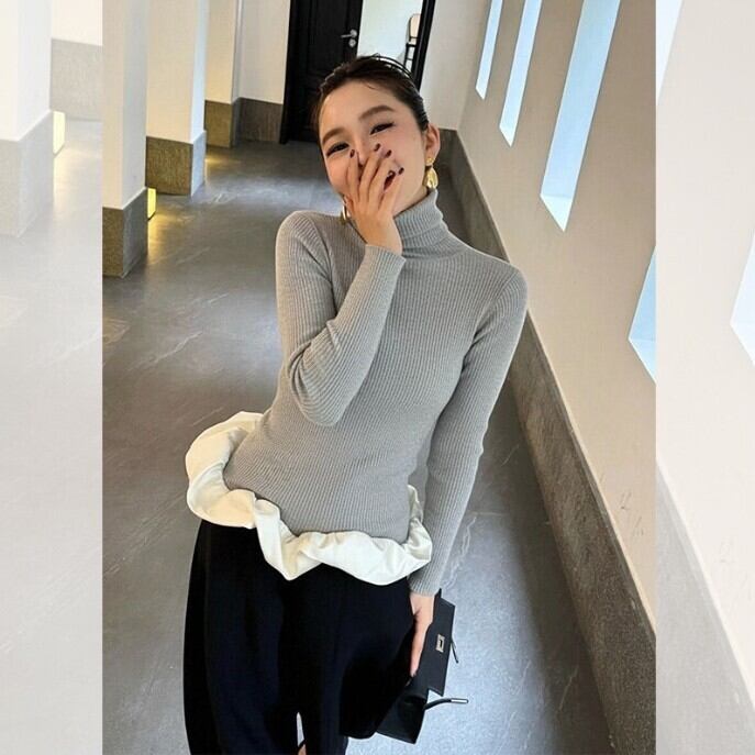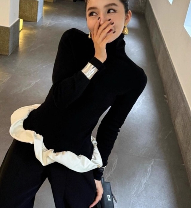 ペプラム ニット タートルネック 異素材 切替 レディース 異素材切替ペプラムタートルニット トップス リブニット ハイネック フリル 裾 ティアード ウエストマーク 着痩せ 体型カバー きれいめ モード カジュアル 大人可愛い 韓国ファッション 上品 高見え デート 20代 30代 40代 CO5418