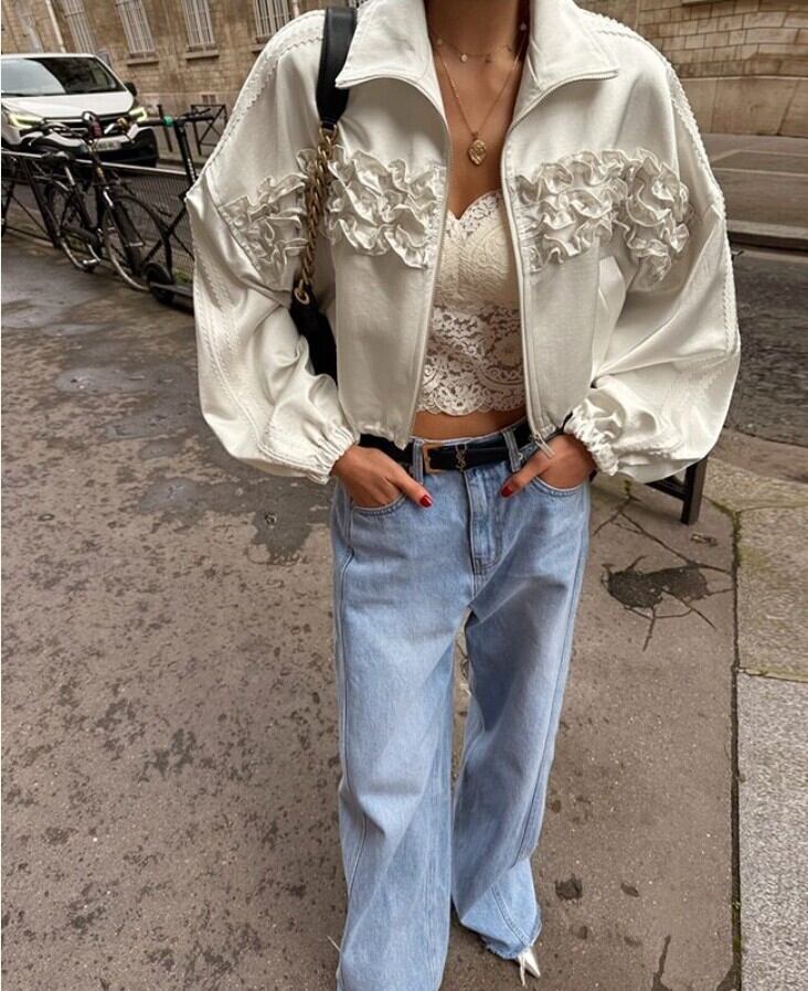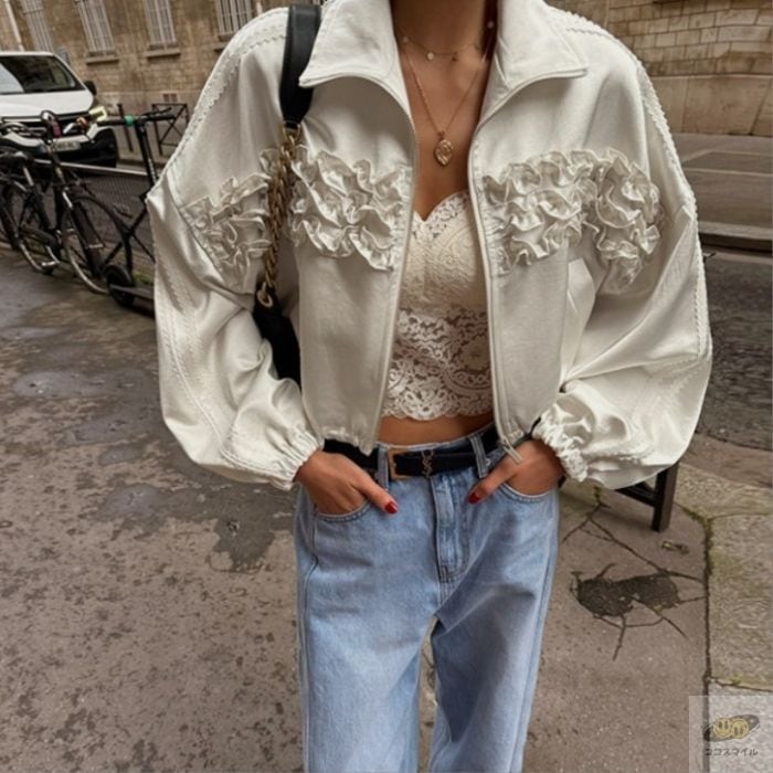 胸元から袖にかけて、贅沢にフリルがあしらわれた、主役級ブルゾン。