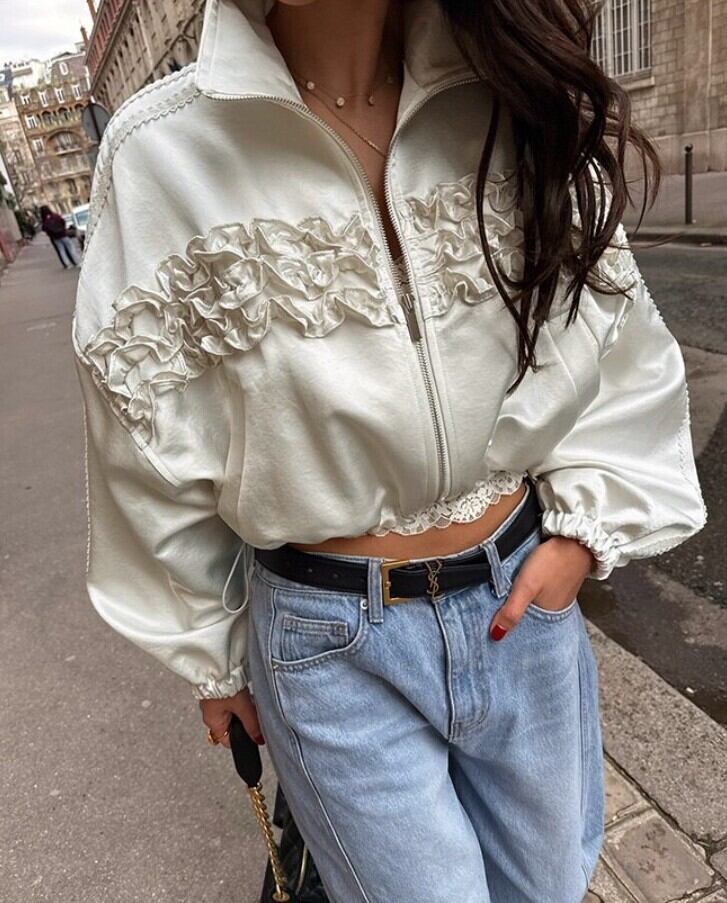 スポーティーなトラックジャケットのシルエットに、フェミニンなフリルをプラス。