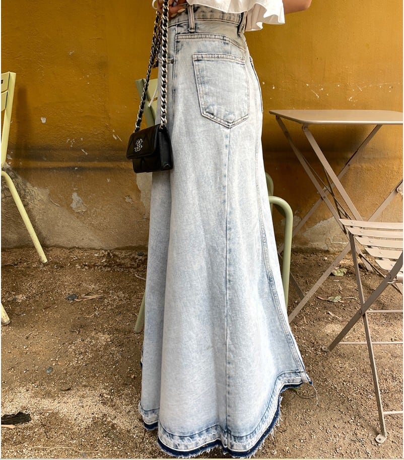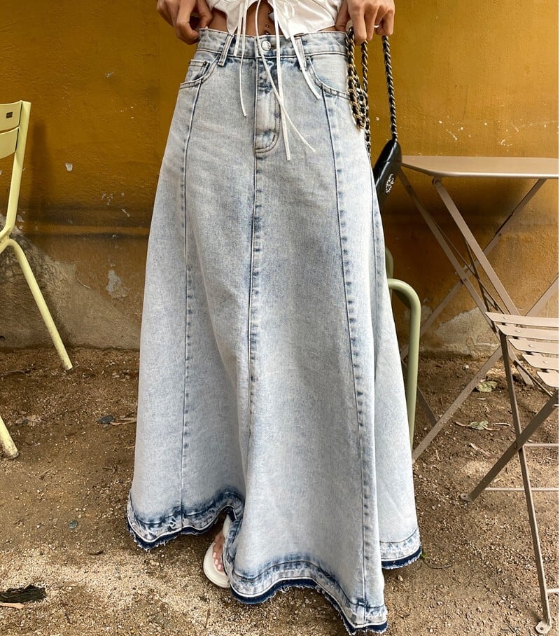 ◇デニム マキシスカート フレア ロングスカート 裾フリンジ ◇