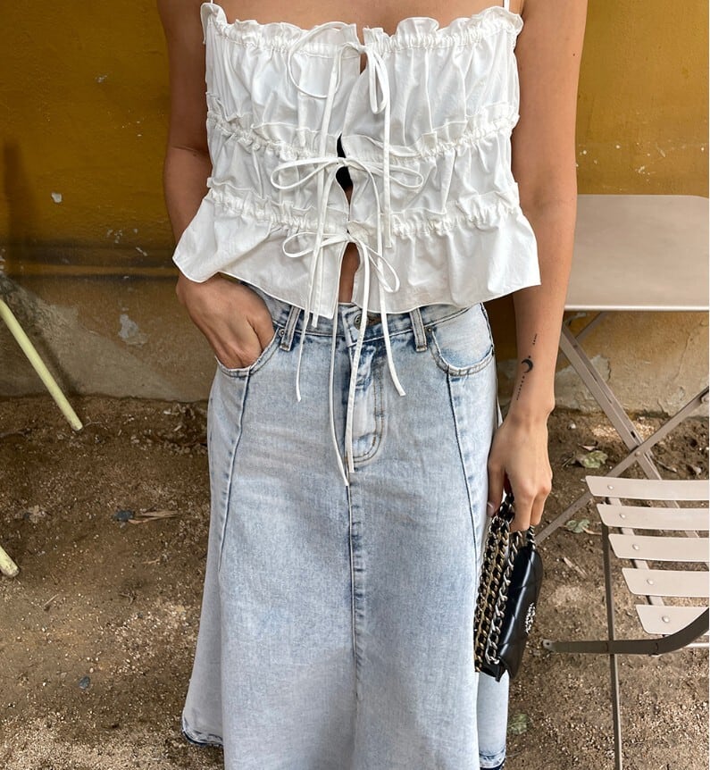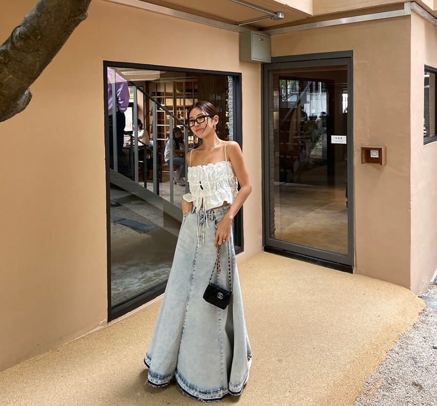 パッチワークのような切り替えデザインが目を惹く、デニムマキシスカート。ヴィンテージライクなユーズド加工と、裾のフリンジ使いがこなれ感を演出。
