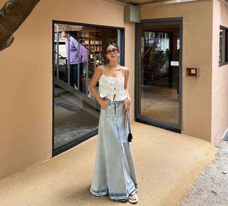デニムスカート デニム マキシスカート フレア ロングスカート 裾フリンジ 切り替え パッチワーク ユーズド加工 Aライン ヴィンテージライク バレエコア Y2K 韓国ファッション 大人可愛い カジュアル 旅行 海 リゾート ココスマイル 30代 40代 ファッション CO5451