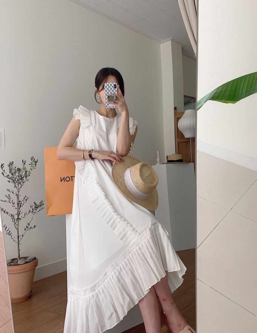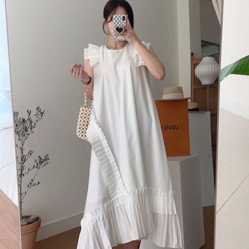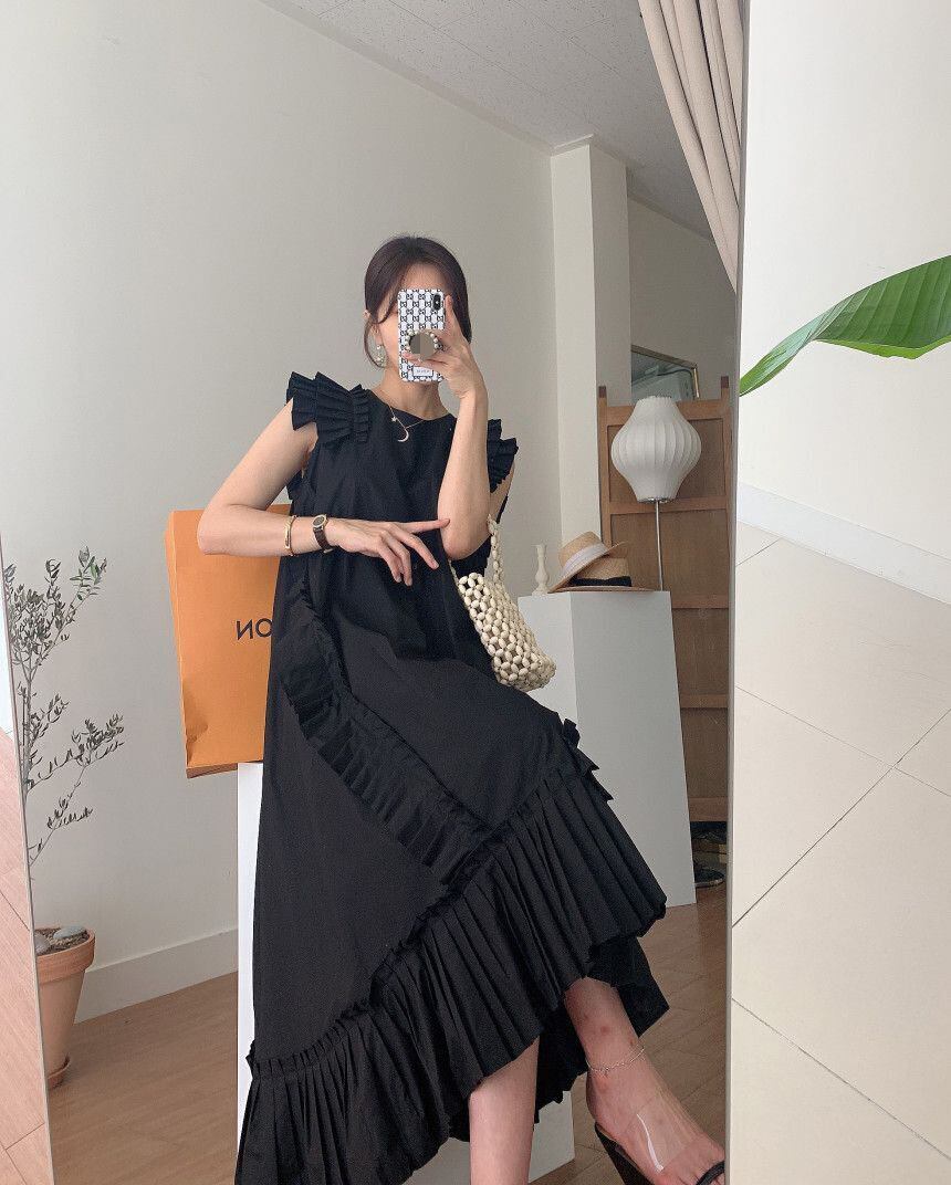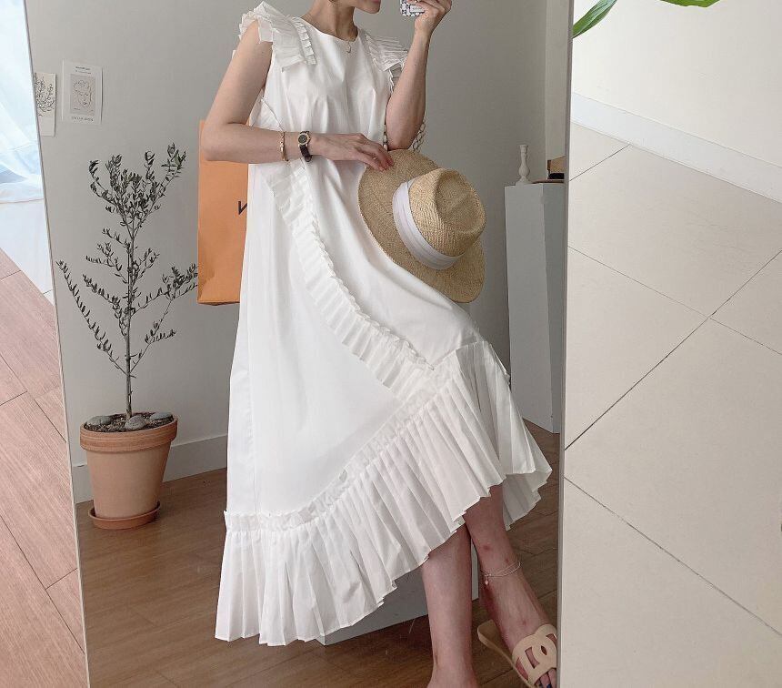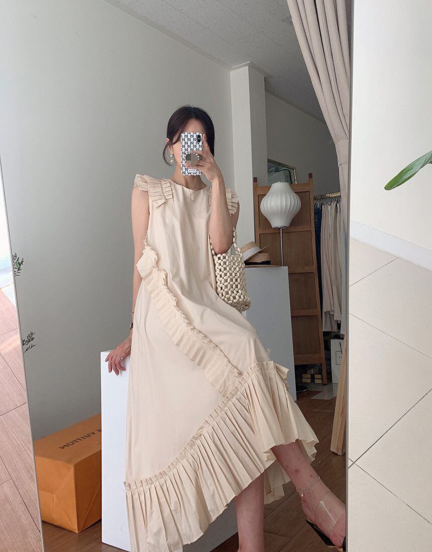【送料無料】レディース ワンピース プリーツ フリル アシンメトリー ワンピース ノースリーブ ミドル丈ワンピース ラウンドネック 大人可愛い フェミニン 夏人気 トレンド リゾート ママファッション ママコーデ 韓国 オルチャン CO39