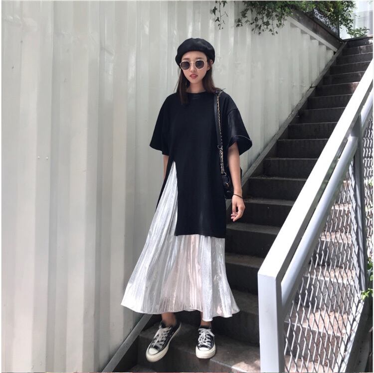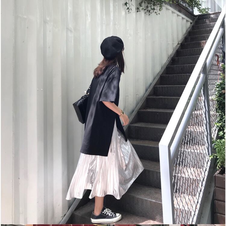 5分袖のTシャツと、メタリックなカラーが印象的なロングプリーツスカートの2点セットです^^