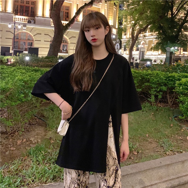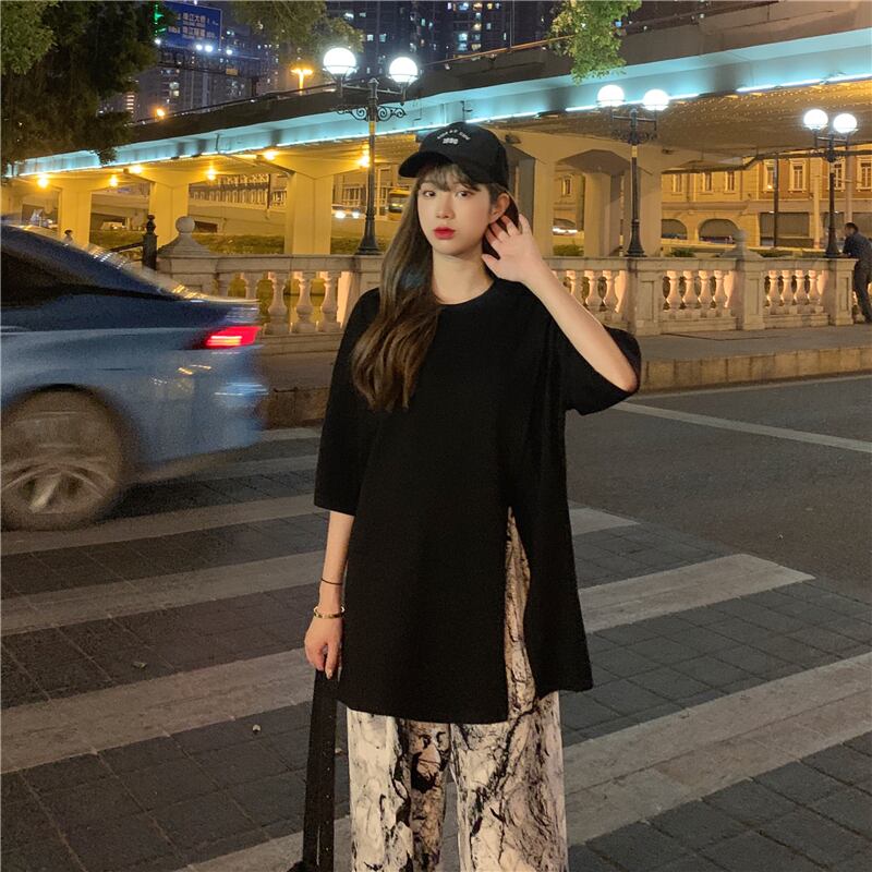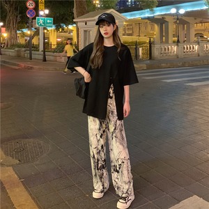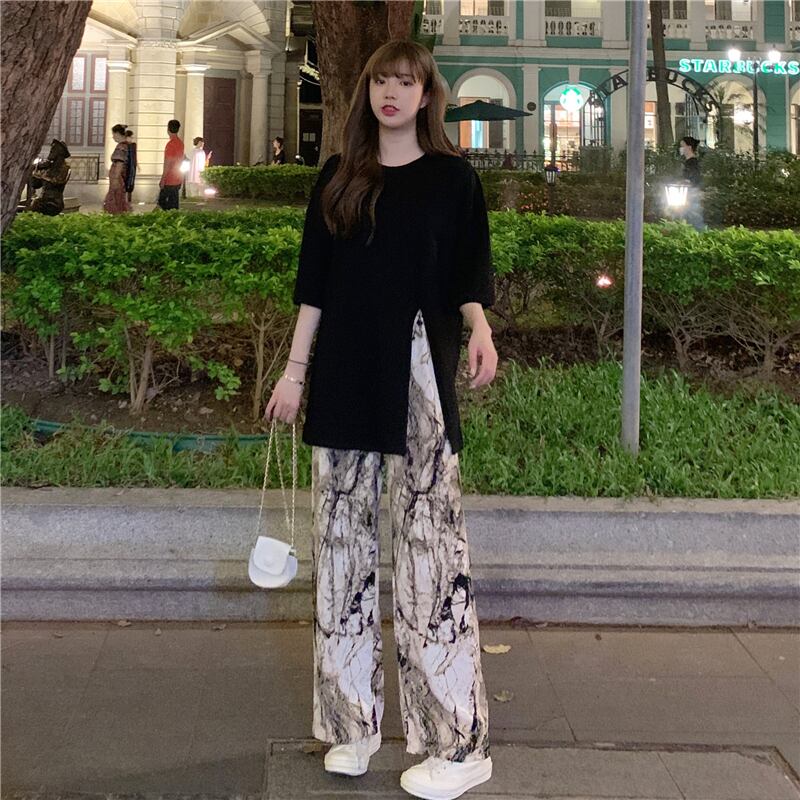【送料無料】レディース 上下セット 2点セット ツーピース カットソー サイドスリット フロントスリット ラウンドネック ブラック 黒 柄パンツ ボトムス シフォン マーブル柄 ウエストゴム ハイウエスト ゆったり 楽ちん 体型カバー ママコーデ ママファッション 大人かわいい メンズライク カジュアル レトロ 韓国ファッション 新作 トレンド 20代 30代 40代 CO106