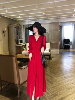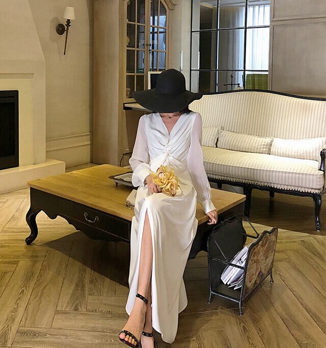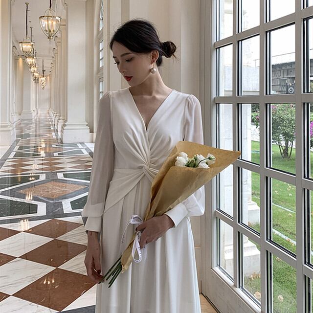 【送料無料】レディース Vネック スプリット 長袖 ドレス ワンピース レトロ ツイスト 2カラー 大人可愛い ママコーデ ママファッション 韓国 オルチャンファッション 人気 トレンド 新作 20代 30代 40代 きれいめ レトロ シンプル 無地 定番 お出かけ デート おしゃれ 通勤 通学 オフィス OL デイリー フェミニン シック 着痩せ 着回し インスタ映え 秋 冬 春 夏 CO244