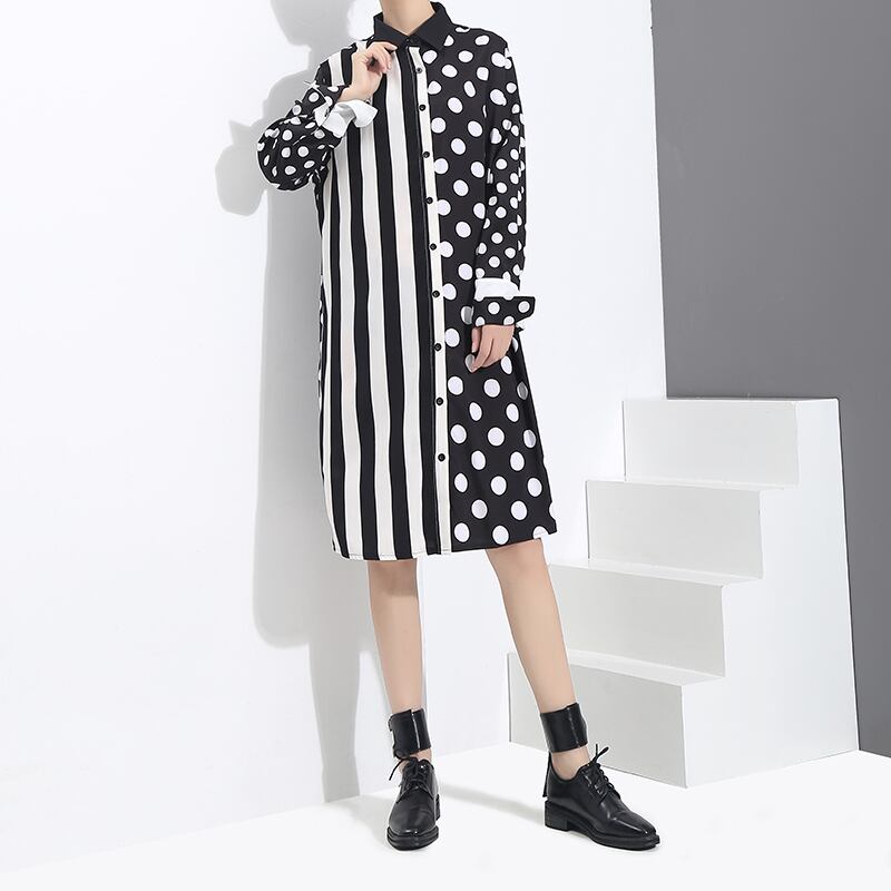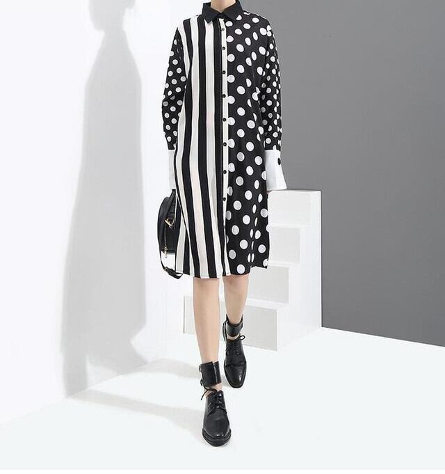 【送料無料】レディース ストライプ&ドット柄 ミドル丈シャツワンピース モード系 長袖 大人可愛い ママコーデ ママファッション 韓国 オルチャンファッション 人気 トレンド 新作 20代 30代 40代 きれいめ レトロ シンプル 定番 スタイリッシュ お出かけ デート おしゃれ 通勤 通学 オフィス OL デイリー 普段着 ラフ カジュアル フェミニン シック 体型カバー 着痩せ 着回し インスタ映え 秋 冬 春 CO579