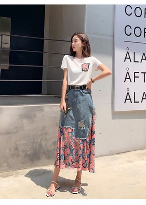 デニム×バンダナデザインが綺麗なミモレ丈のデニムスカート