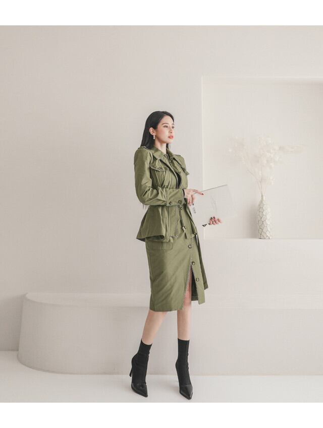 デザイン性の高いショートトレンチジャケットとハイウエストスカートのツーピース