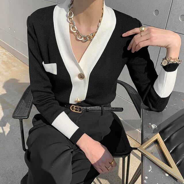 【送料無料】レディース セーター スリム 長袖 バイカラー ゴールドボタン トップス シングルブレスト 大人可愛い ママコーデ ママファッション 韓国 オルチャンファッション 人気 トレンド 新作 20代 30代 40代 きれいめ レトロ シンプル 定番 スタイリッシュ お出かけ デート おしゃれ 通勤 通学 オフィス OL デイリー 普段着 ラフ カジュアル フェミニン シック 体型カバー 着痩せ 着回し インスタ映え 秋 冬 春 CO1755