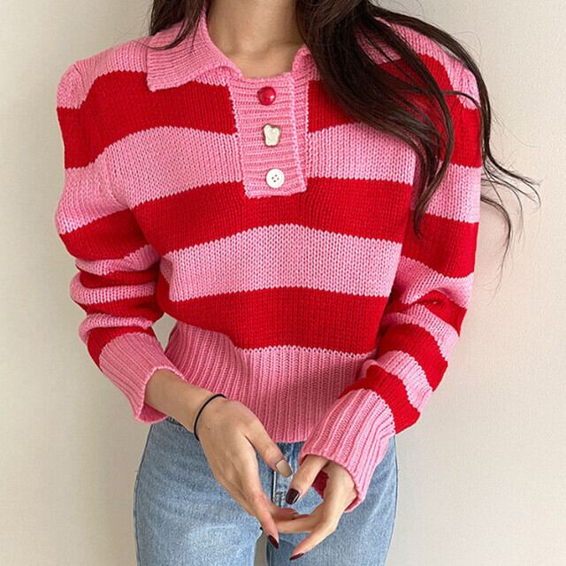 【送料無料】レディース ニット セーター 長袖 ボタンデザイン ポロカラー ボーダー 2カラー 大人可愛い ママコーデ ママファッション 韓国 オルチャンファッション 人気 トレンド 新作 20代 30代 40代 きれいめ レトロ シンプル 定番 スタイリッシュ お出かけ デート おしゃれ 通勤 通学 オフィス OL デイリー 普段着 ラフ カジュアル フェミニン シック 体型カバー 着痩せ 着回し インスタ映え 秋 冬 CO1762