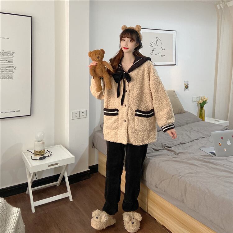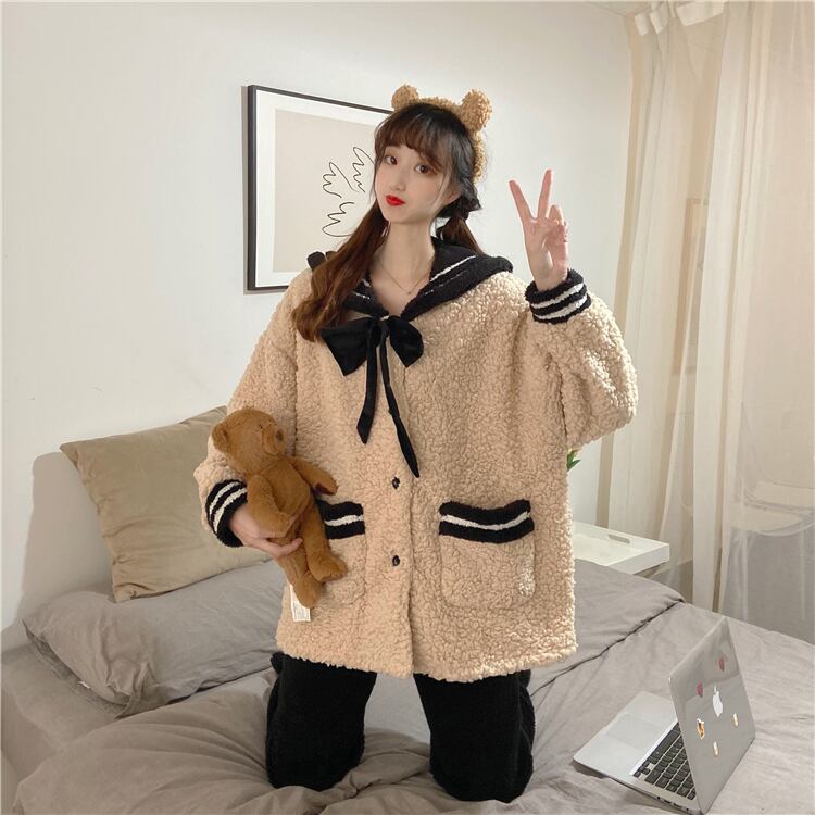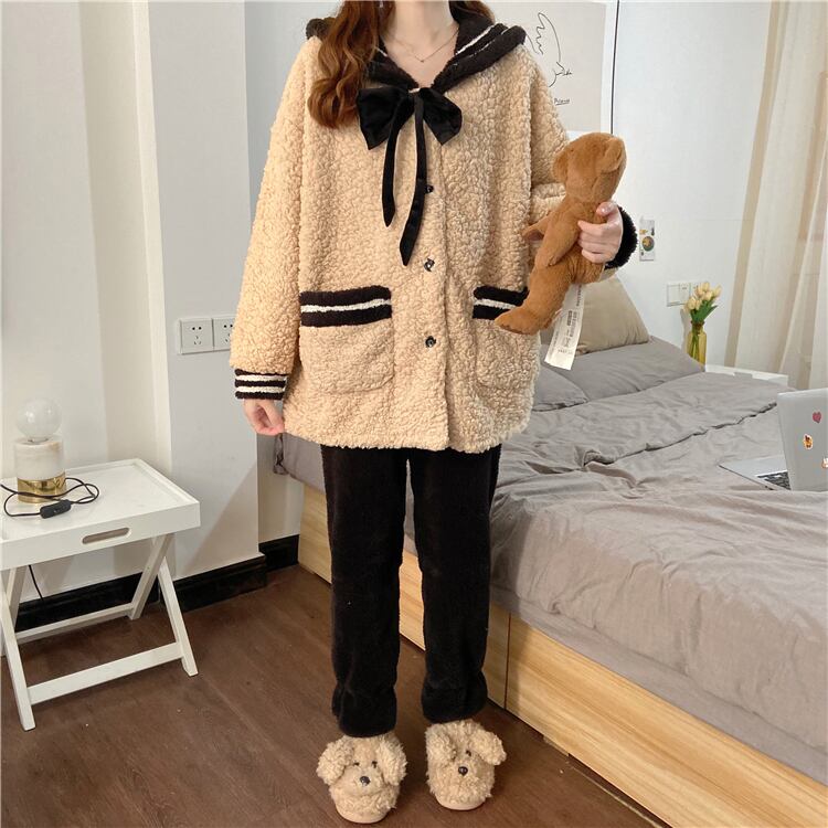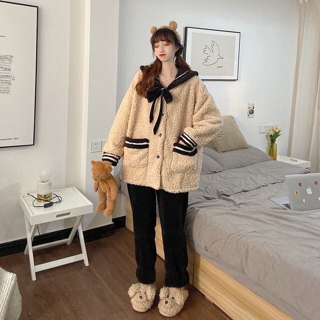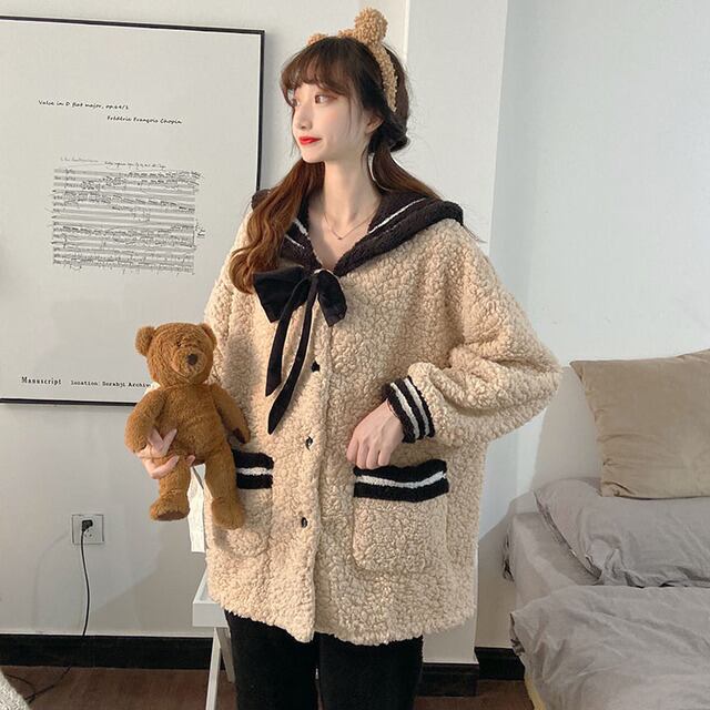【送料無料】レディース もこもこ かわいい 上下セット 秋 冬 パジャマ 寝巻き 部屋着 ホームウェア リボン 襟付き ポケット 制服風 セーラー服 ベージュ 大人可愛い ママコーデ ママファッション 韓国 オルチャンファッション 人気 トレンド 新作 20代 30代 40代 ルームウェア セットアップ 2点セット 2ピース ツーピース 上下セット 部屋着 寝巻き おうち時間 家着 ステイホーム おしゃれ カジュアル 可愛い シンプル 無地 ゆったり デイリー 普段使い ふわふわ あったか CO1617