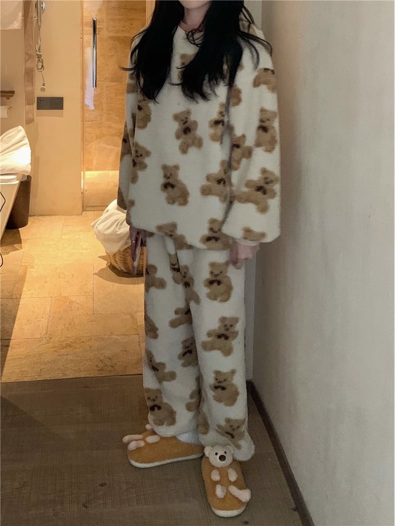 【送料無料】レディース クマ柄パジャマ ルームウェア パジャマ 部屋着 寝巻き ナイトウェア 袖あり 長袖 ラウンドネック 大人可愛い ママコーデ ママファッション 韓国 オルチャンファッション 人気 トレンド 新作 20代 30代 40代 セットアップ 2点セット 2ピース ツーピース 上下セット 部屋着 寝巻き おうち時間 家着 ステイホーム おしゃれ カジュアル 可愛い シンプル 無地 ゆったり デイリー 普段使い もこもこ ふわふわ あったか 秋 冬 CO1633