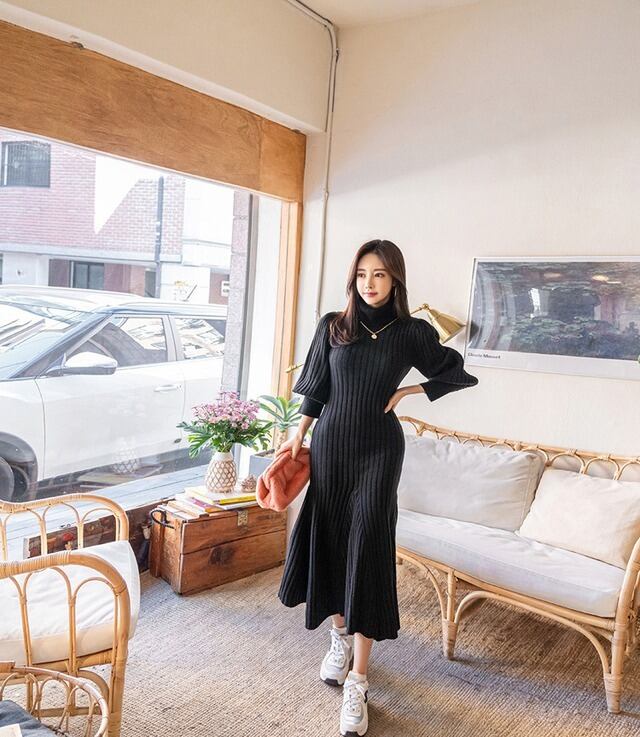 ランタンスリーブとフィッシュテールスカートのラインが綺麗なニットワンピース