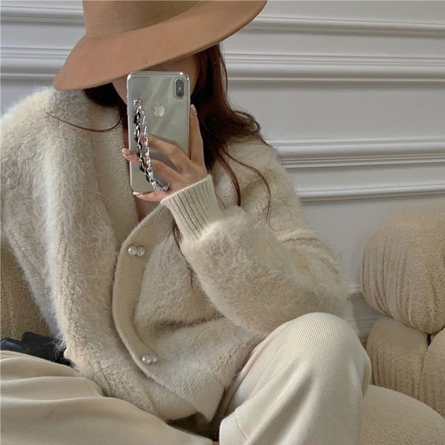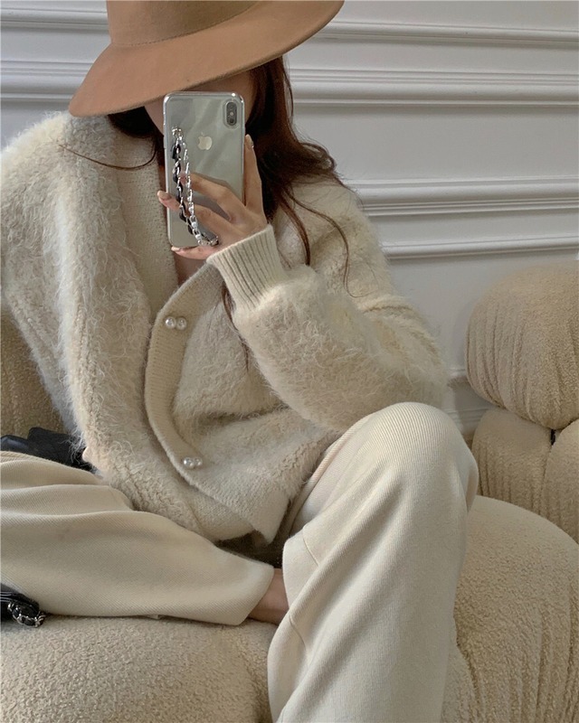 フワフワの生地と2つ並んだパールボタンが可愛いカーディガン