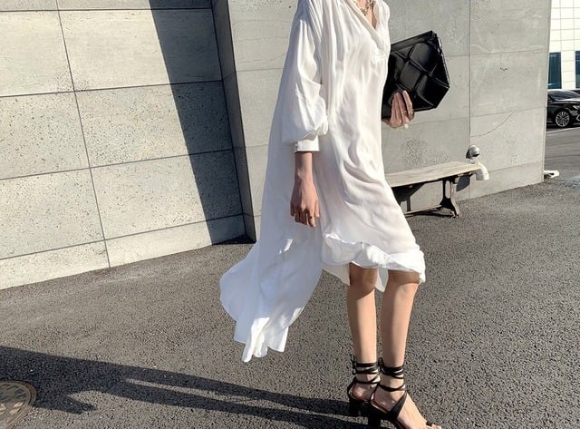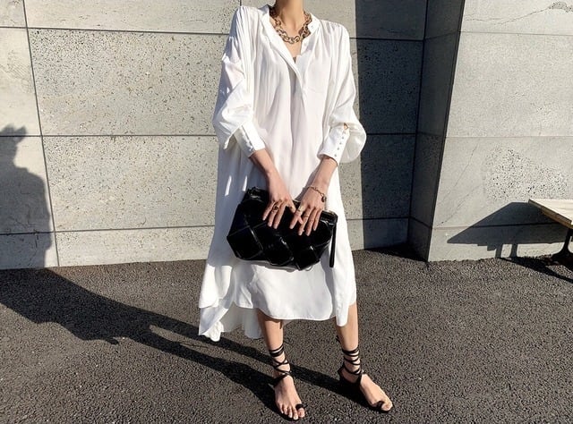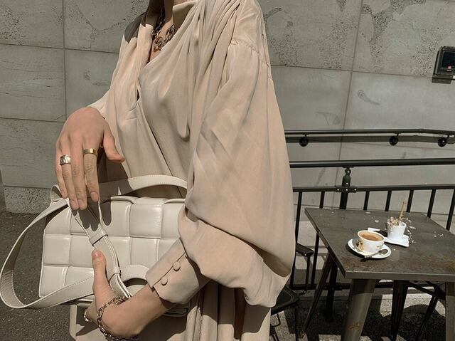 イレギュラースカートとランタンスリーブがオシャレな長袖シャツワンピース