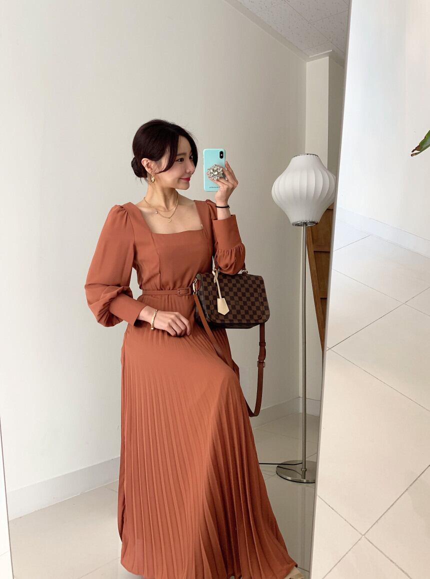 【送料無料】レディース スクエアネック プリーツ ワンピース 長袖 ランタンスリーブ 切替 ベルト付き ウエストマーク Aライン ロング丈 マキシ丈 ミモレ丈 大人可愛い ママコーデ ママファッション 韓国 オルチャンファッション 人気 トレンド 新作 20代 30代 40代 きれいめ レトロ シンプル 定番 スタイリッシュ お出かけ デート おしゃれ 通勤 通学 オフィス OL デイリー 普段着 ラフ カジュアル フェミニン シック 体型カバー 着痩せ 着回し インスタ映え 秋 冬 春 CO1846