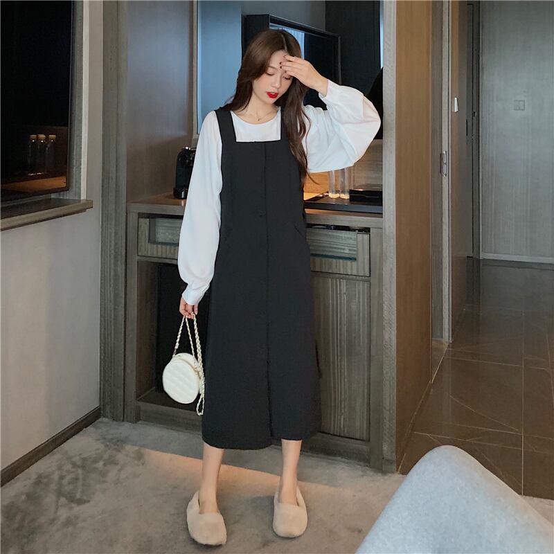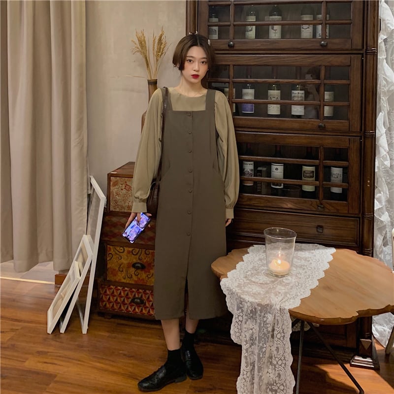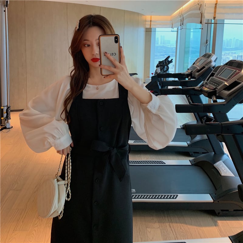 ランタンスリーブブラウスとサスペンダースカートの2点セット。