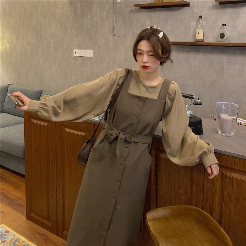 【送料無料】レディース【セットアップ】 ランタンスリーブ ブラウス サロペット オールインワン スカート セット 2点セット ツーピース 長袖 ラウンドネック 袖コンシャス ボリューム袖 大人可愛い ママコーデ ママファッション 韓国 オルチャンファッション 人気 トレンド 新作 20代 30代 40代 きれいめ レトロ シンプル 定番 お出かけ デート おしゃれ 通勤 通学 オフィス OL デイリー カジュアル フェミニン シック 体型カバー 着痩せ 着回し インスタ映え 秋 冬 春 CO1884