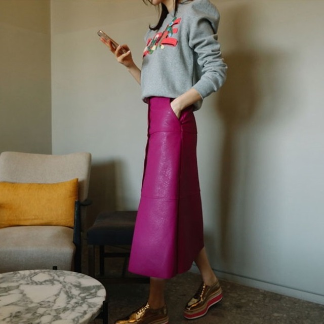 スタイリッシュな着こなしを演出する美シルエットのレザースカート。