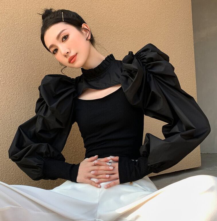 トレンドのランタンスリーブがポイントのデザイントップス。