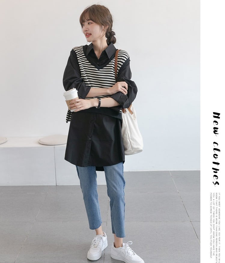 ベーシックなブラウスにVネックのベスト付きチュニックシャツ。