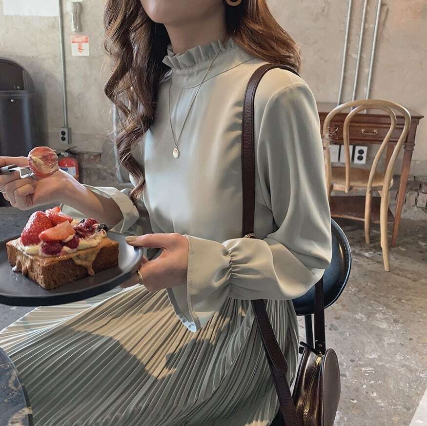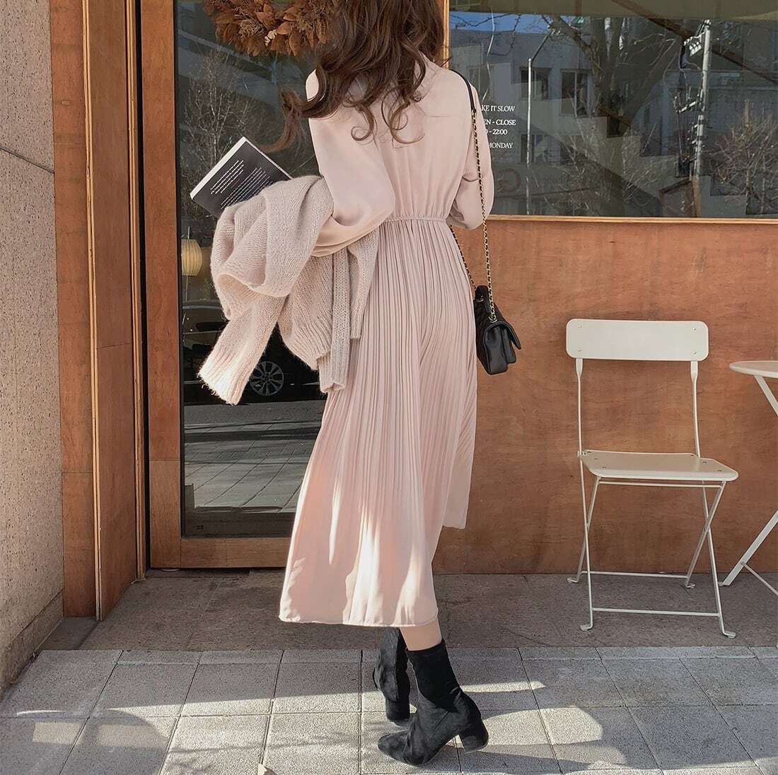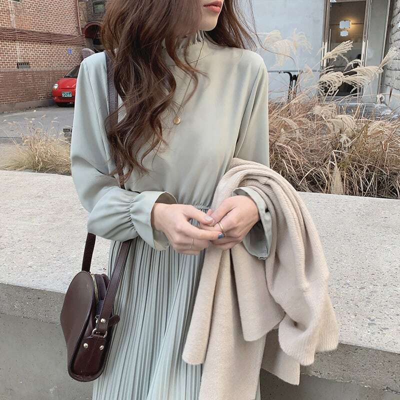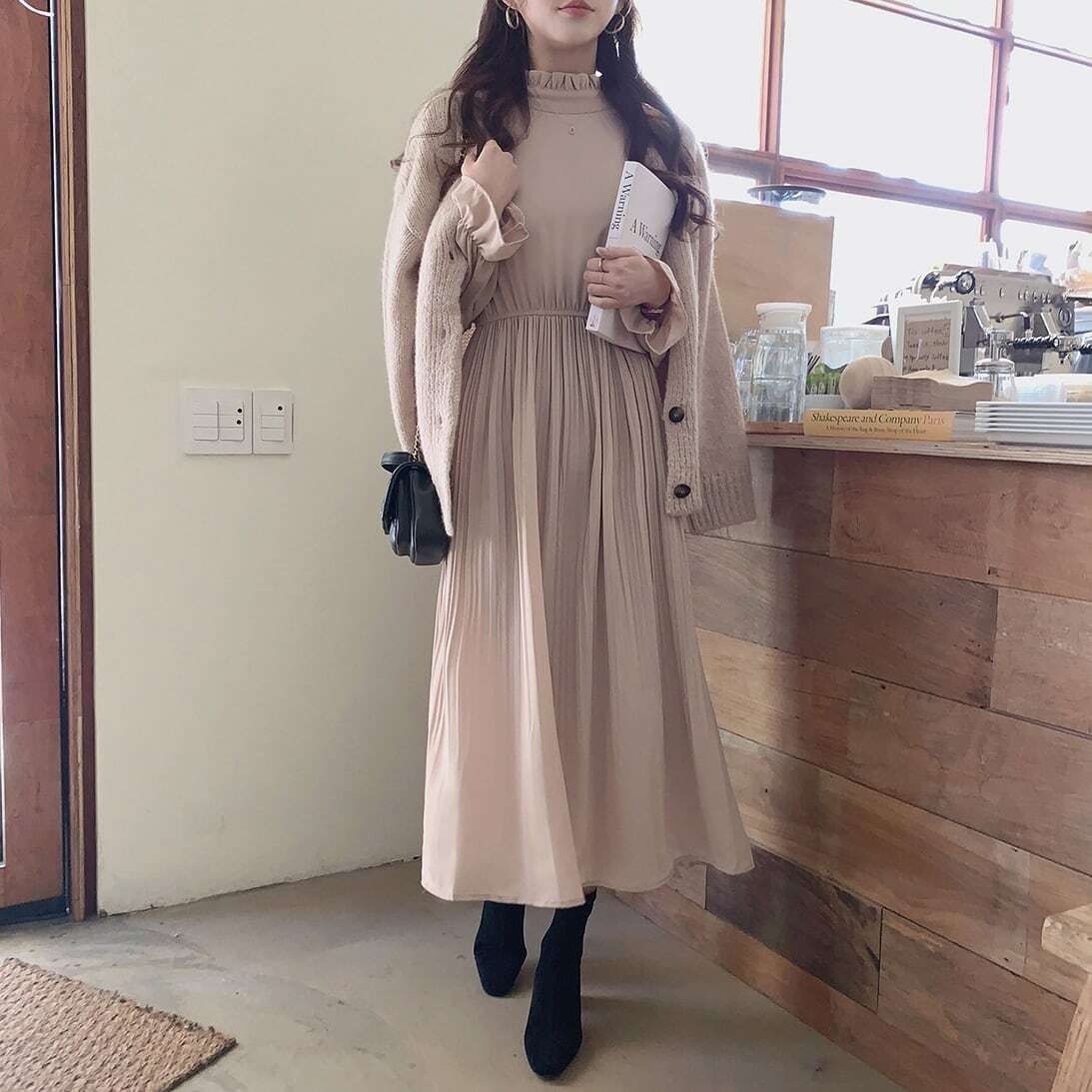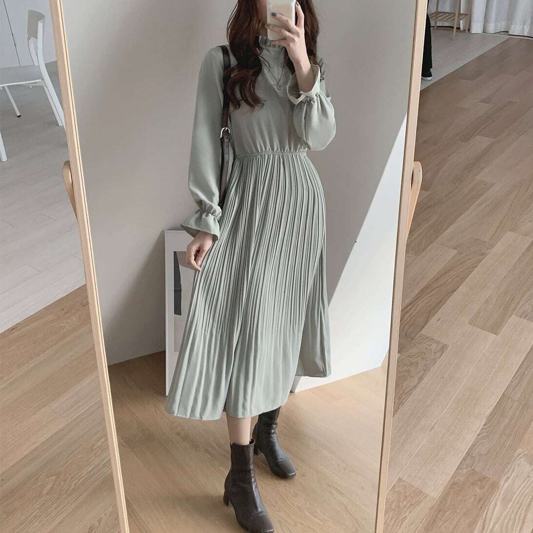 【送料無料】レディース 冬服 立襟 ロング ワンピース OLワンピ ハイネック フリル プリーツ キャンディースリーブ 大人可愛い ママコーデ ママファッション 韓国 オルチャンファッション 人気 トレンド 新作 20代 30代 40代 きれいめ レトロ シンプル 無地 定番 お出かけ デート おしゃれ 通勤 通学 オフィス OL デイリー 普段着 ラフ カジュアル フェミニン シック ゆったり 体型カバー 着痩せ 着回し インスタ映え 秋 冬 春 CO2380
