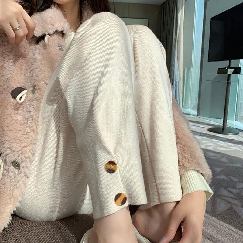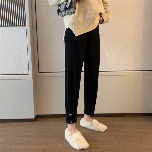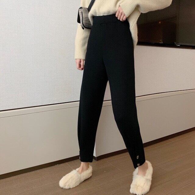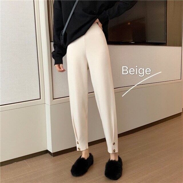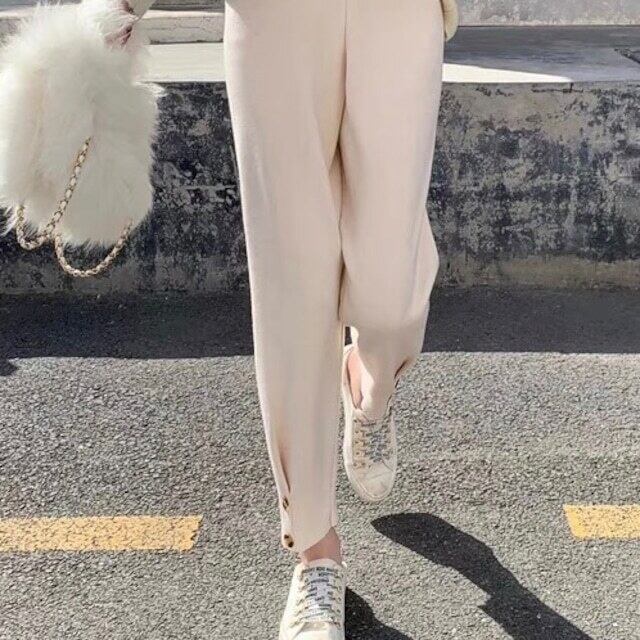 細かいリブになったパンツで裾が絞られた、