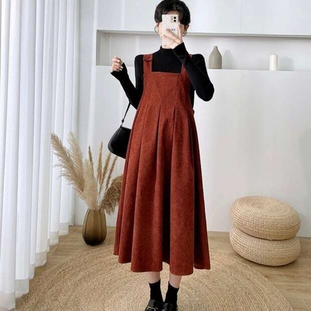 動きが出て綺麗なベロア生地ワンピースと、黒のハイネックニットのセットアップ。