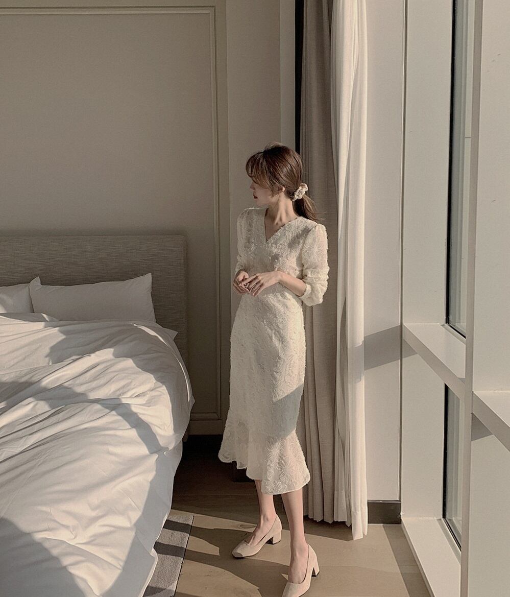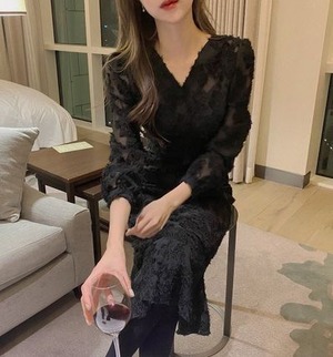 Vネックラインと総レースのデザインが女性らしさを引き立てる一品です。大人可愛い印象を