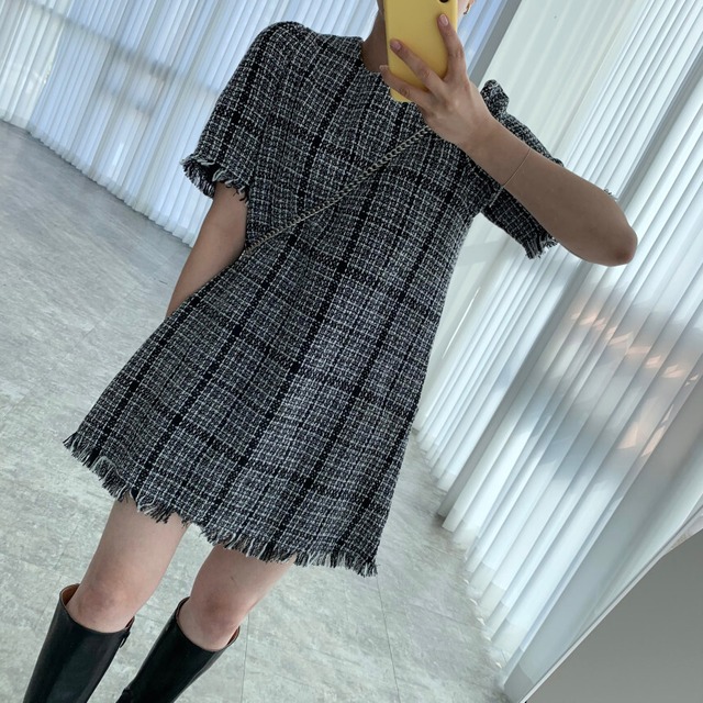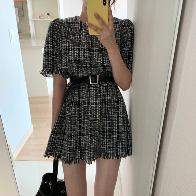 【送料無料】レディース ワンピース ツイード フリンジ チェック柄 半袖 ミニ丈 ミニワンピース 大人可愛い ママコーデ ママファッション 韓国 オルチャンファッション 人気 トレンド 新作 20代 30代 40代 きれいめ レトロ シンプル お出かけ デート おしゃれ 通勤 通学 オフィス OL デイリー 普段着 ラフ カジュアル フェミニン シック ゆったり 体型カバー 着痩せ 着回し インスタ映え 春 秋 冬 CO2914