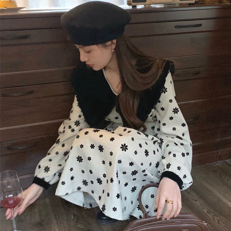 【送料無料】レディース 2カラー ワンピース ミモレ丈 花柄 ドット 長袖 ビッグカラー 大きめ襟 バイカラー 大人可愛い ママコーデ ママファッション 韓国 オルチャンファッション 人気 トレンド 新作 20代 30代 40代 きれいめ レトロ シンプル お出かけ デート おしゃれ 通勤 通学 オフィス OL デイリー 普段着 ラフ カジュアル フェミニン シック ゆったり 体型カバー 着痩せ 着回し インスタ映え 秋 冬 CO2922