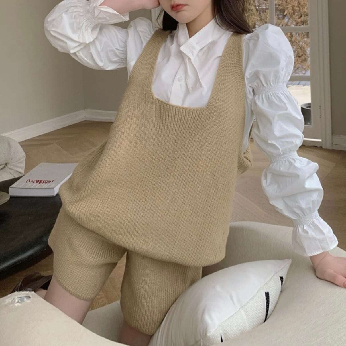 【送料無料】レディース セットアップ シャツ ニットベスト ニットショートパンツ 3点セット ギャザースリーブ 大人可愛い ママコーデ ママファッション 韓国 オルチャンファッション 人気 トレンド 新作 20代 30代 40代 きれいめ レトロ シンプル お出かけ デート おしゃれ 通勤 通学 オフィス OL デイリー 普段着 ラフ カジュアル フェミニン シック ゆったり 体型カバー 着痩せ 着回し インスタ映え 春 秋 冬 CO2934