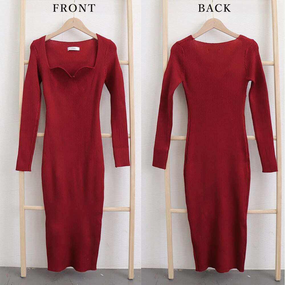 ボディーラインを強調してくれるペンタゴンネックのニットワンピース。