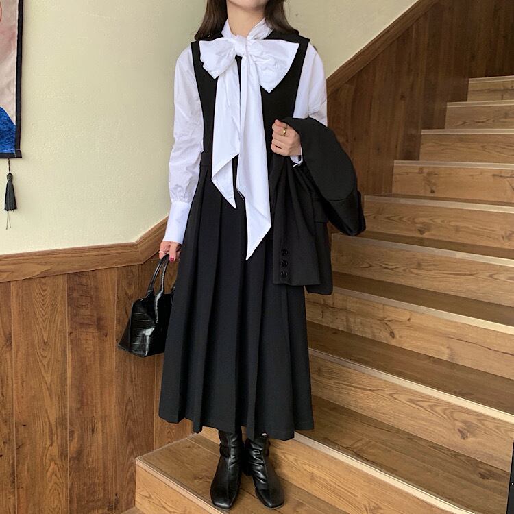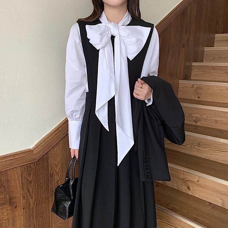 【送料無料】レディース セットアップ ワンピース シャツ 2点セット ボウタイブラウス 長袖 プリーツスカート 大人可愛い ママコーデ ママファッション 韓国 オルチャンファッション 人気 トレンド 新作 20代 30代 40代 きれいめ レトロ シンプル お出かけ デート おしゃれ 通勤 通学 オフィス OL デイリー 普段着 ラフ カジュアル フェミニン シック ゆったり 体型カバー 着痩せ 着回し インスタ映え 春 秋 冬 CO2942