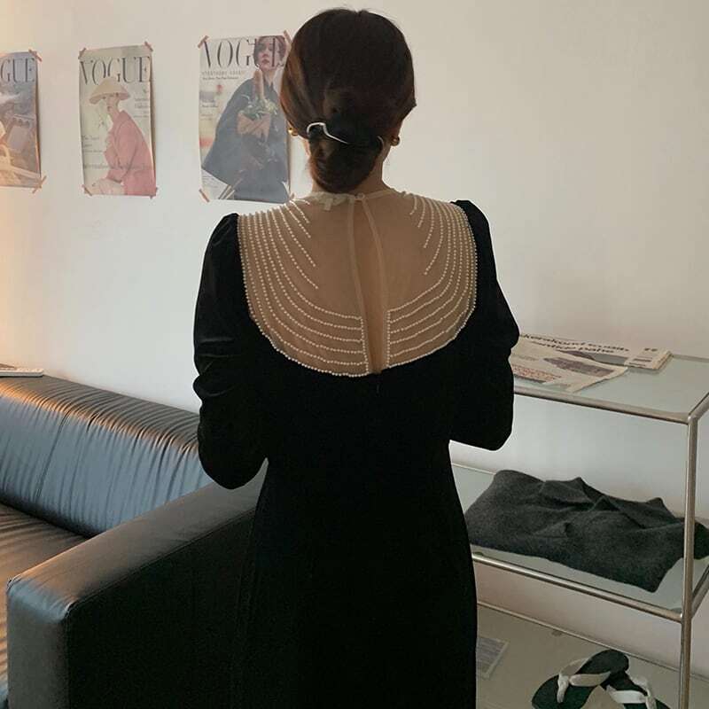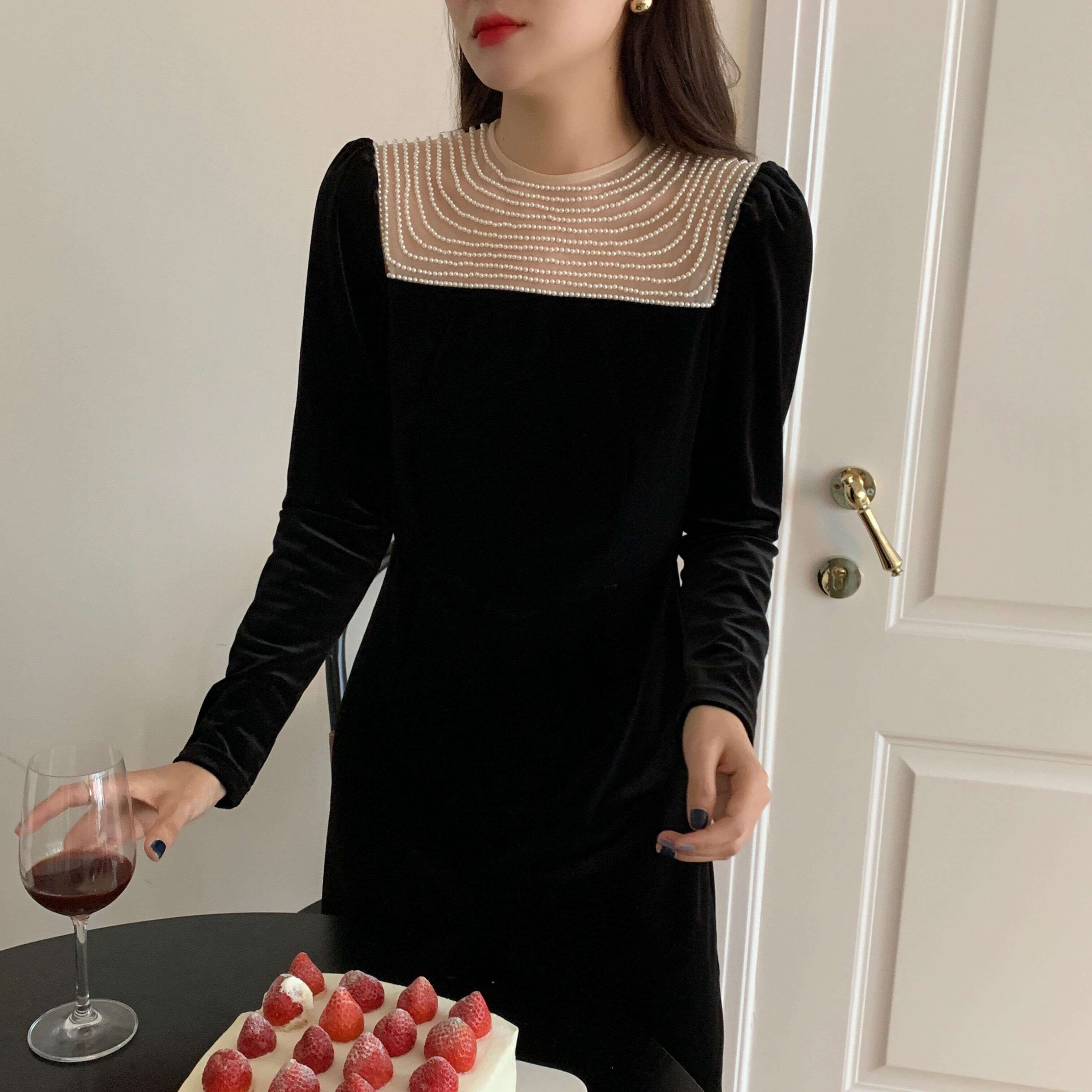 【送料無料】レディース ワンピース ロングワンピース パール ベルベット ブラック 大人可愛い ママコーデ ママファッション 韓国 オルチャンファッション 人気 トレンド 新作 20代 30代 40代 きれいめ レトロ シンプル 無地 定番 お出かけ デート おしゃれ 通勤 通学 オフィス OL デイリー 普段着 ラフ カジュアル フェミニン シック ゆったり 体型カバー 着痩せ 着回し インスタ映え 秋 冬 春 CO2738