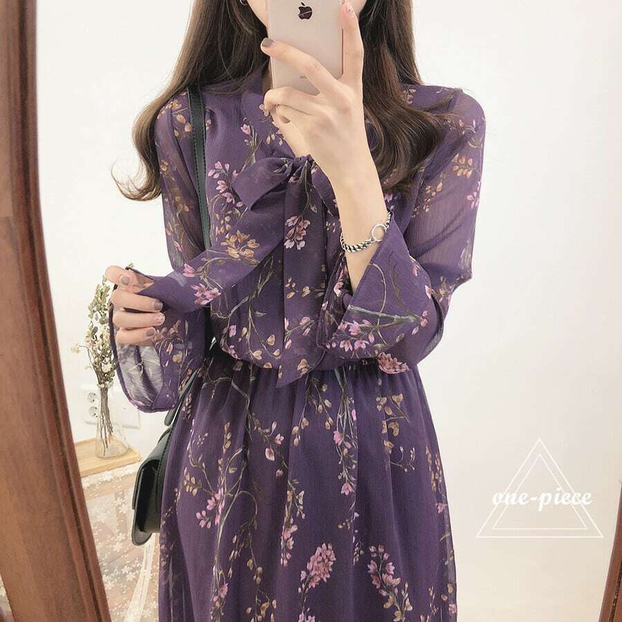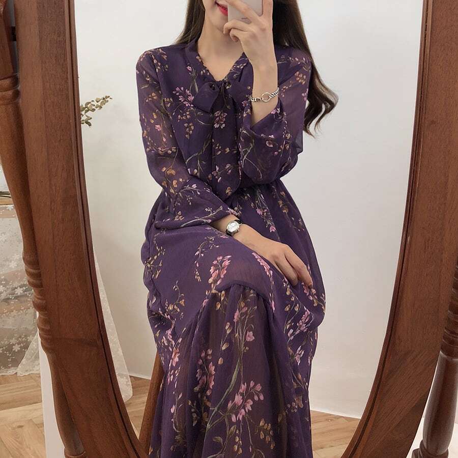 【送料無料】レディース 花柄 ロングワンピース 韓国ファッション パープル リボン シフォン 大人可愛い ママコーデ ママファッション 韓国 オルチャンファッション 人気 トレンド 新作 20代 30代 40代 きれいめ レトロ シンプル 無地 定番 お出かけ デート おしゃれ 通勤 通学 オフィス OL デイリー 普段着 ラフ カジュアル フェミニン シック ゆったり 体型カバー 着痩せ 着回し インスタ映え 秋 春 CO2745