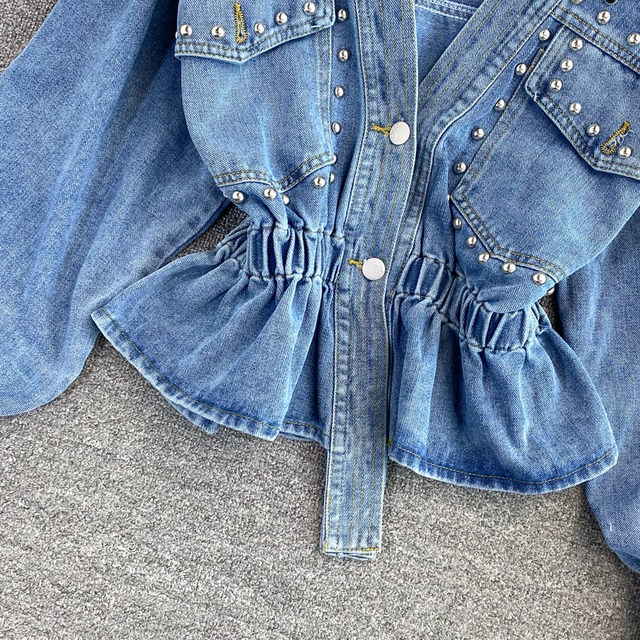 【送料無料】レディース デニムジャケット ギャザー スタッズ Vネック 長袖 大人可愛い ママコーデ ママファッション 韓国 オルチャンファッション 人気 トレンド 新作 20代 30代 40代 きれいめ レトロ シンプル お出かけ デート おしゃれ 通勤 通学 オフィス OL デイリー 普段着 ラフ カジュアル フェミニン シック ゆったり 体型カバー 着痩せ 着回し インスタ映え 春 秋 冬 CO2952