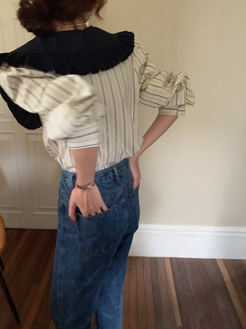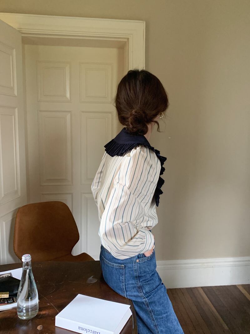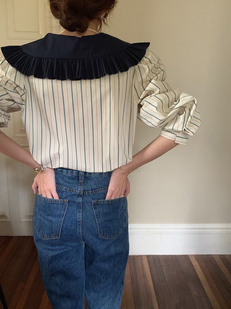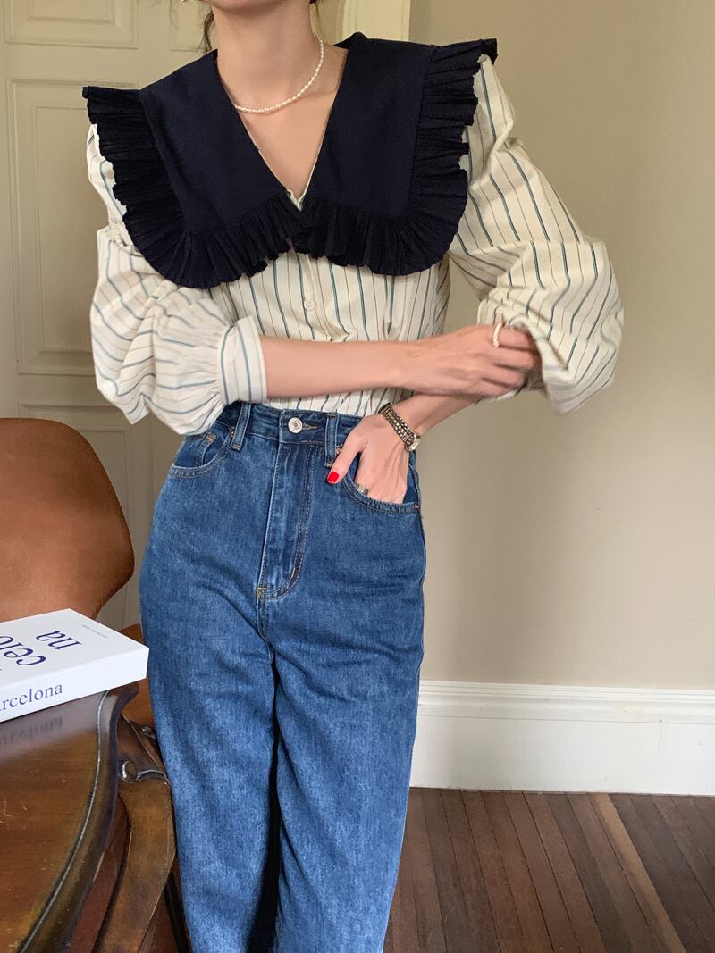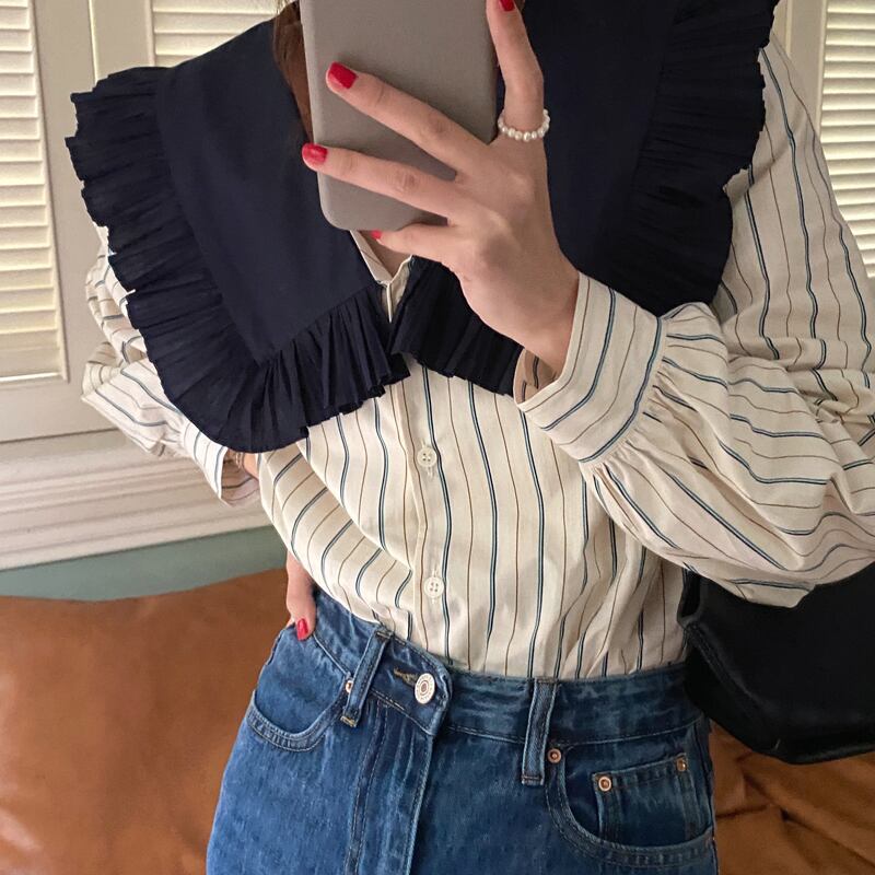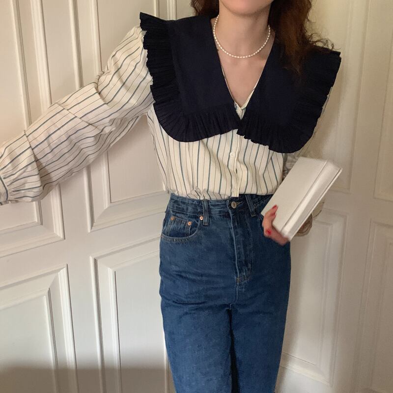 【送料無料】レディース ブラウス シャツ ビックカラー フリルカラー ストライプ 長袖 大人可愛い ママコーデ ママファッション 韓国 オルチャンファッション 人気 トレンド 新作 20代 30代 40代 きれいめ レトロ シンプル お出かけ デート おしゃれ 通勤 通学 オフィス OL デイリー 普段着 ラフ カジュアル フェミニン シック ゆったり 体型カバー 着痩せ 着回し インスタ映え 春 秋 冬 CO2986