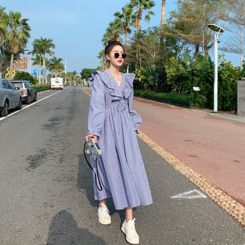 【送料無料】レディース ワンピース フリル 長袖 ストライプ ロング丈 ロングワンピース Vネック 大人可愛い ママコーデ ママファッション 韓国 オルチャンファッション 人気 トレンド 新作 20代 30代 40代 きれいめ レトロ シンプル お出かけ デート おしゃれ 通勤 通学 オフィス OL デイリー 普段着 ラフ カジュアル フェミニン シック ゆったり 体型カバー 着痩せ 着回し インスタ映え 春 秋 CO2987