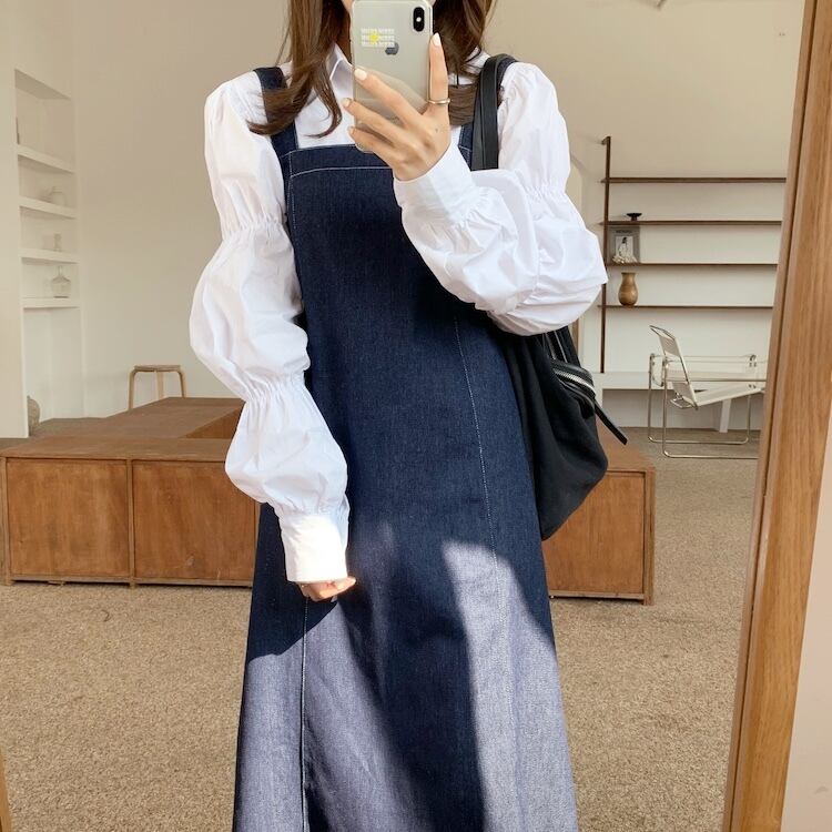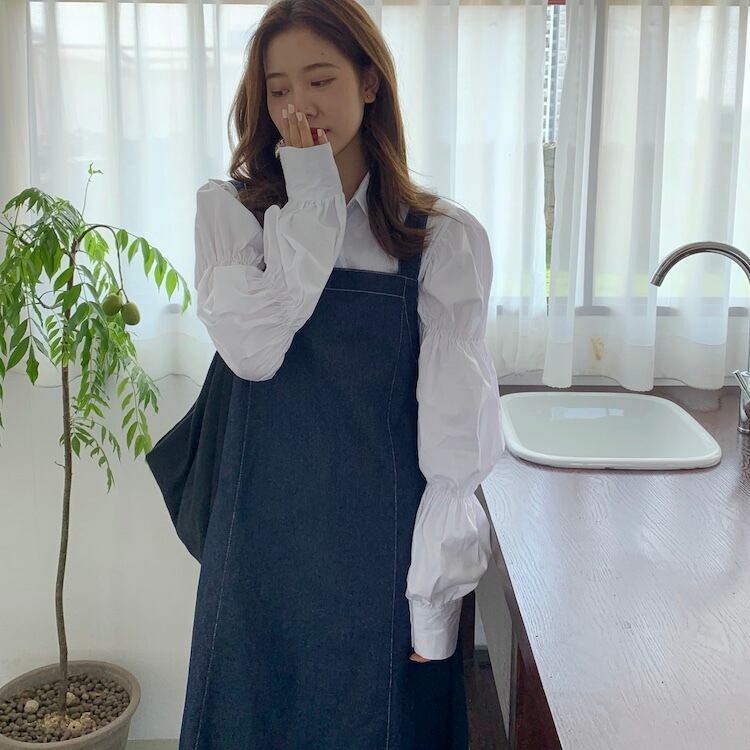 【送料無料】レディース 2点セット シャツ オールインワンスカート ギャザー 長袖 ロング丈 ジャンパースカート デニム 大人可愛い ママコーデ ママファッション 韓国 オルチャンファッション 人気 トレンド 新作 20代 30代 40代 きれいめ レトロ シンプル お出かけ デート おしゃれ 通勤 通学 オフィス OL デイリー 普段着 ラフ カジュアル フェミニン シック ゆったり 体型カバー 着痩せ 着回し インスタ映え 春 秋 CO2990