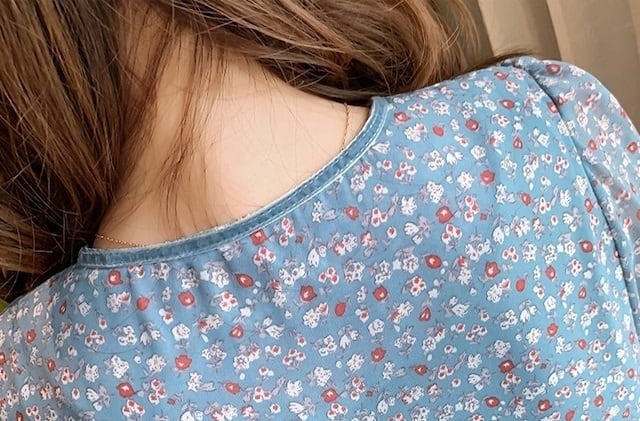 襟のリボンがスウィートなアクセントを効かせる小花柄ワンピース。