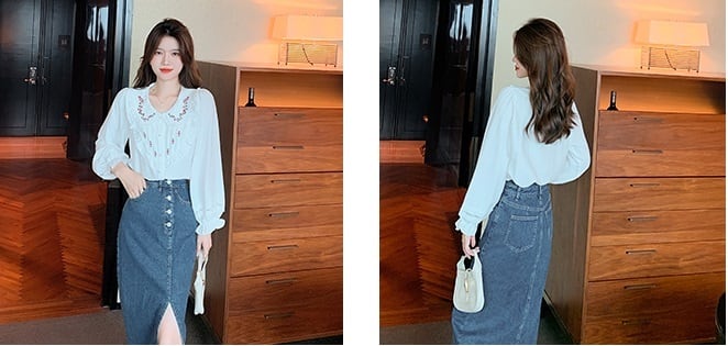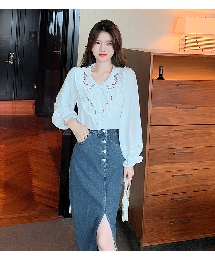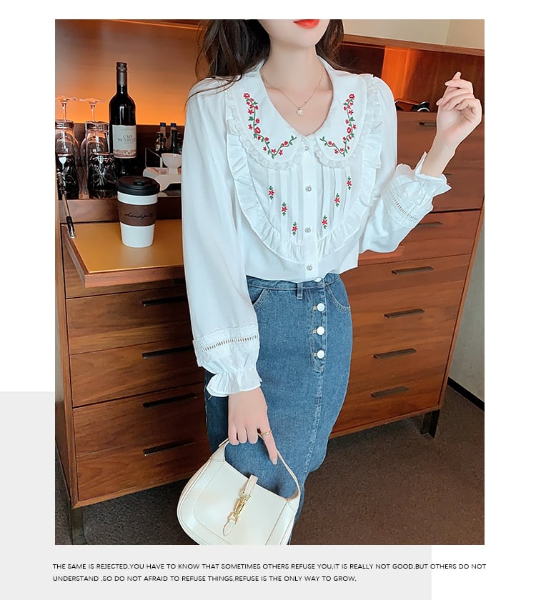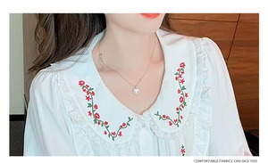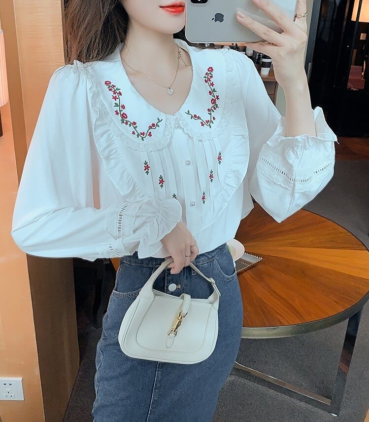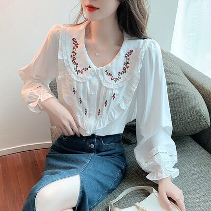 【送料無料】レディース ブラウス フリルカラー プリーツ フラワー 花 刺繡 パールボタン ギャザー袖 長袖 ホワイト 大人可愛い ママコーデ ママファッション 韓国 オルチャンファッション 人気 トレンド 新作 20代 30代 40代 きれいめ レトロ シンプル お出かけ デート おしゃれ 通勤 通学 オフィス OL デイリー 普段着 ラフ カジュアル フェミニン シック ゆったり 体型カバー 着痩せ 着回し インスタ映え 春 秋 CO3000